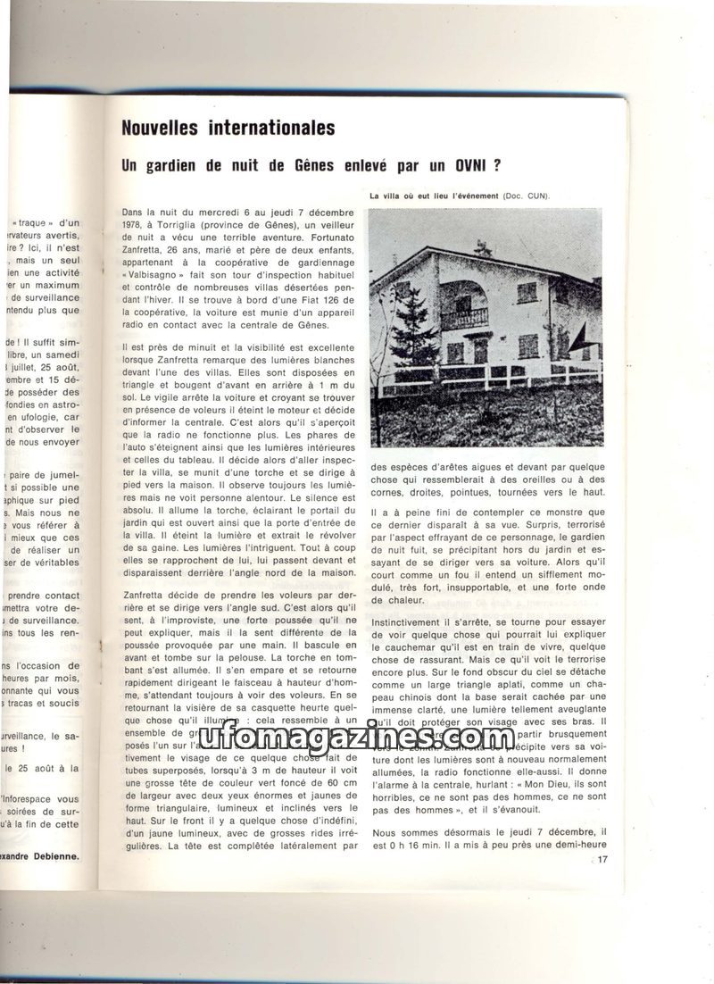 The issue details the alleged abduction of Fortunato Zanfretta, a night watchman in Torriglia, Genoa, in December 1978. Zanfretta reported his car and radio failing, followed by an
