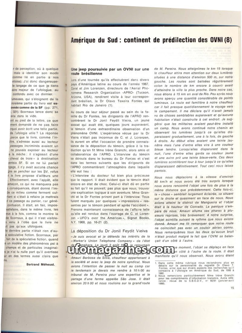 This issue of Inforespace magazine delves into UFO phenomena, particularly in South America. It details a 1967 incident in Brazil where Dr. Jonil Feydit Vieira reported being pursu