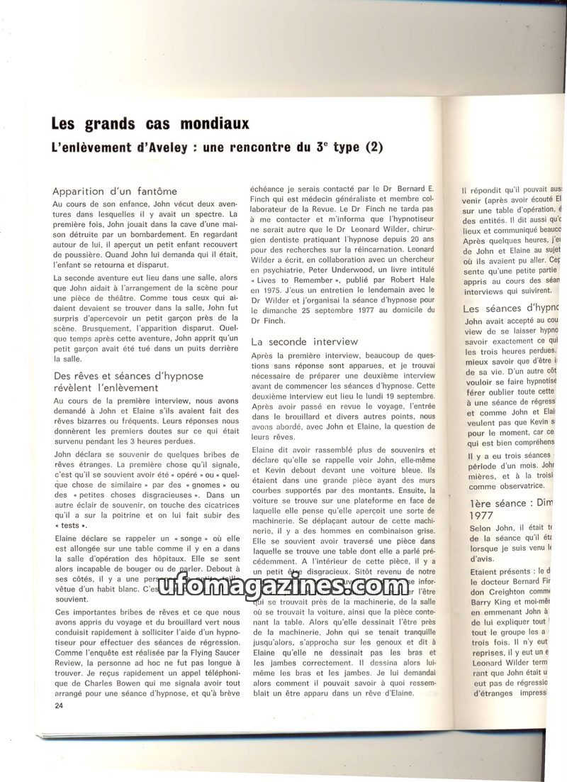 This issue details the Aveley abduction case, focusing on witness John's experiences and subsequent hypnosis sessions. John and Elaine recall fragmented dreams and a 'lost time' ev
