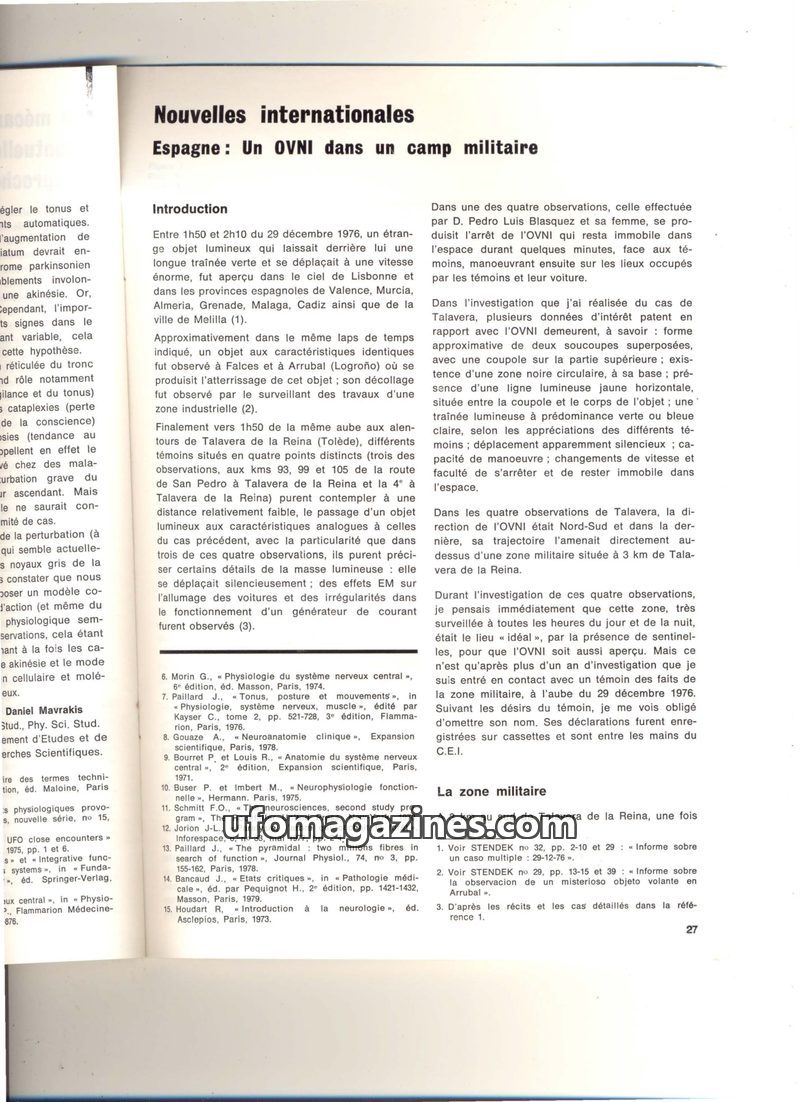 This issue details a significant UFO sighting over a military zone in Talavera de la Reina, Spain, on December 29, 1976. Multiple witnesses, including military personnel, reported