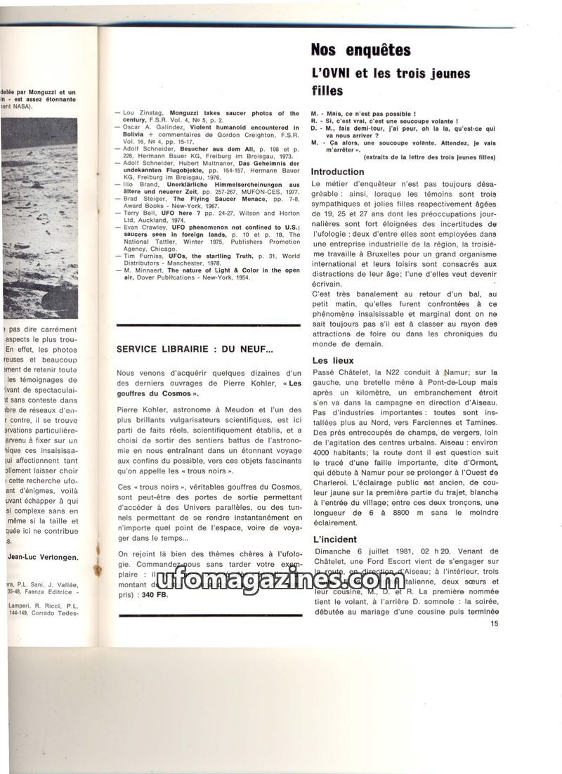 The issue details an investigation into a UFO sighting by three young women in Aiseau, Belgium, on July 6, 1981. The object was described as a red-orange trapezoidal shape moving s