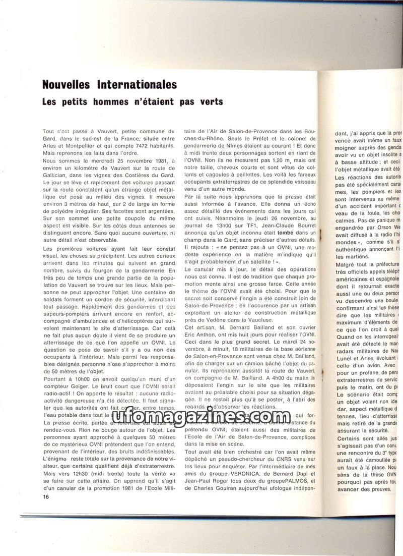 In November 1981, a metallic object landed in Vauvert, France, causing a sensation and attracting media attention. It was later revealed to be an elaborate hoax orchestrated by mil
