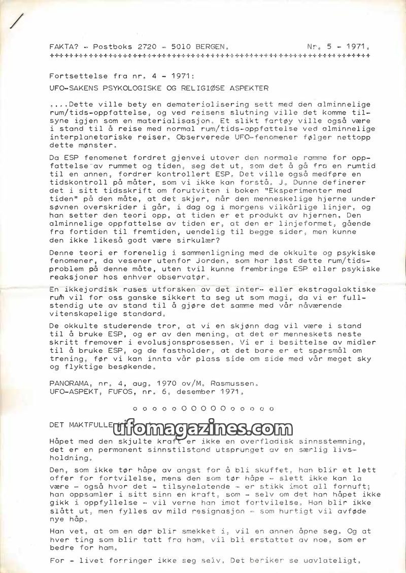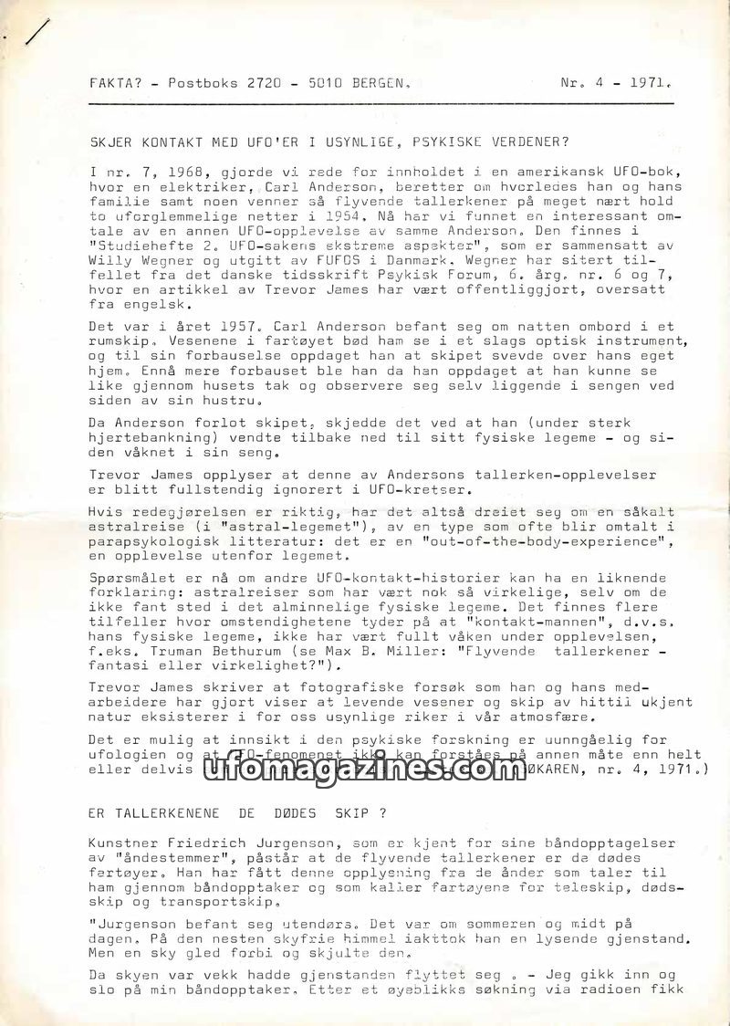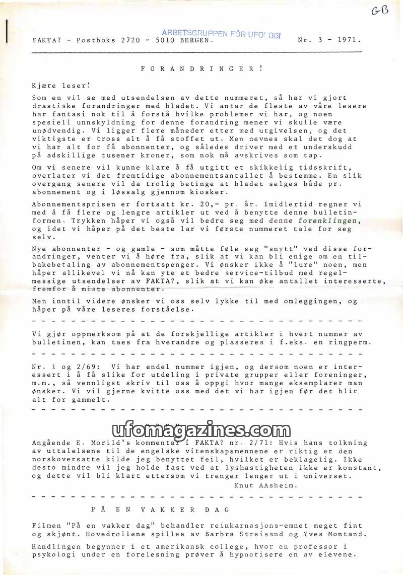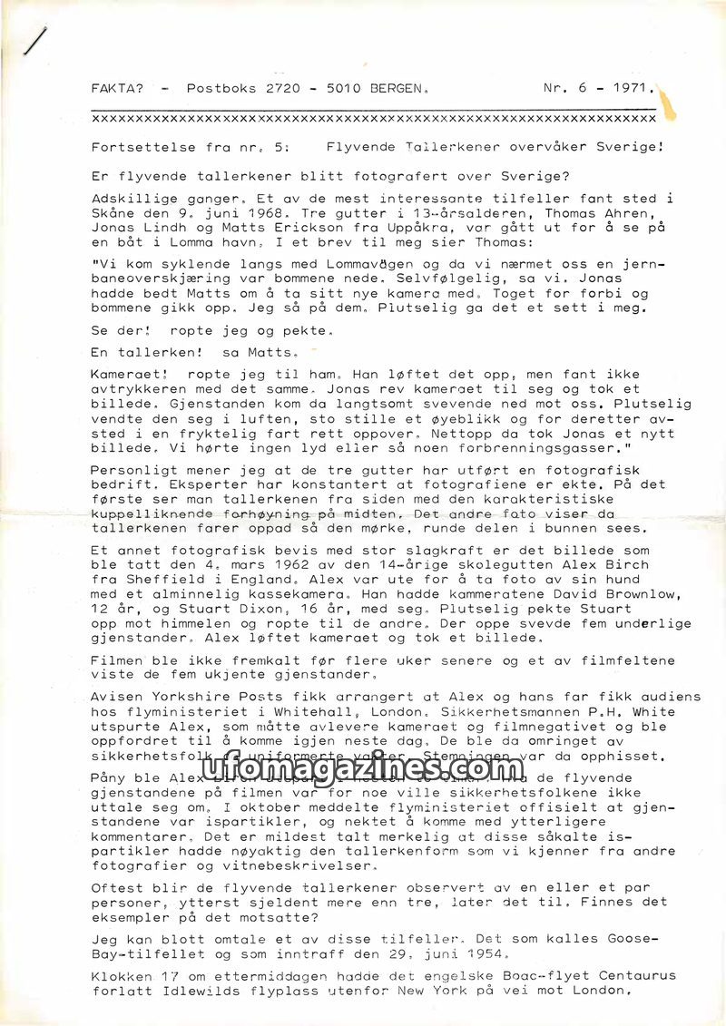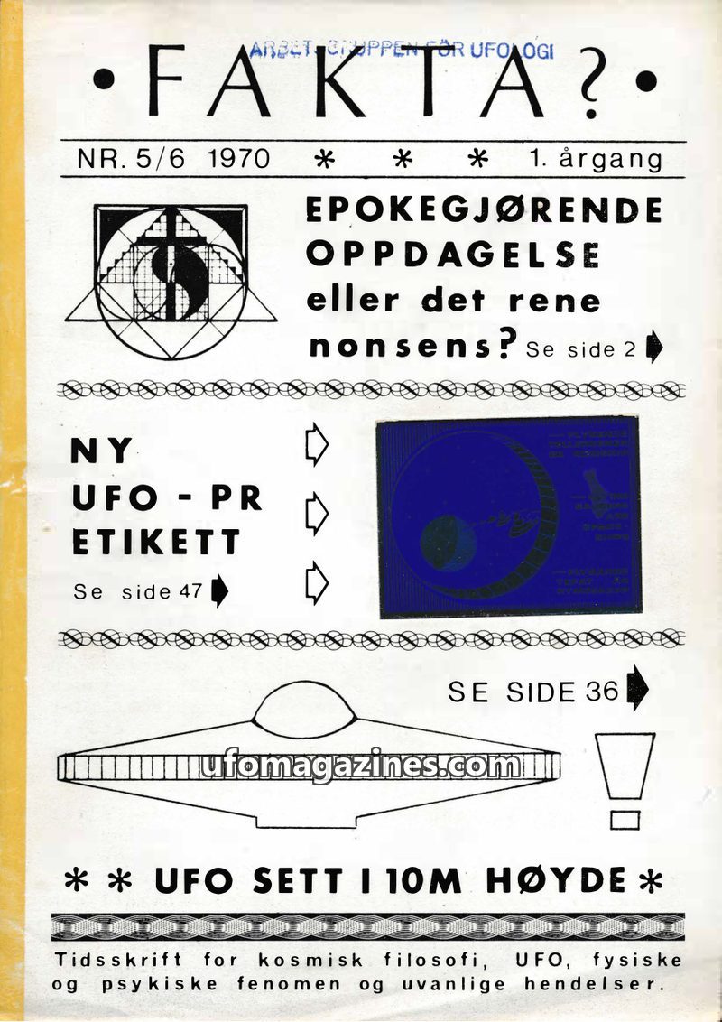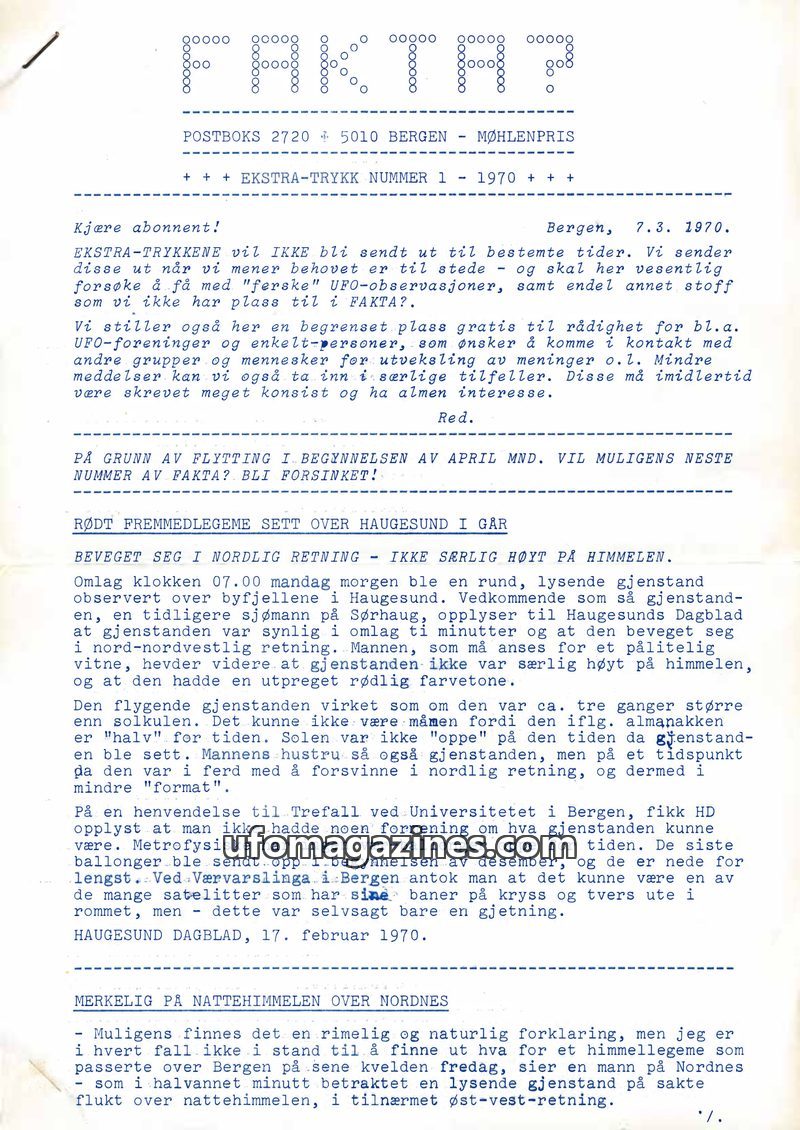 This issue of FAKTA? features several UFO sightings reported in Norway and Sweden during early 1970, including a red object over Haugesund and a fast-moving fireball over Järna. It