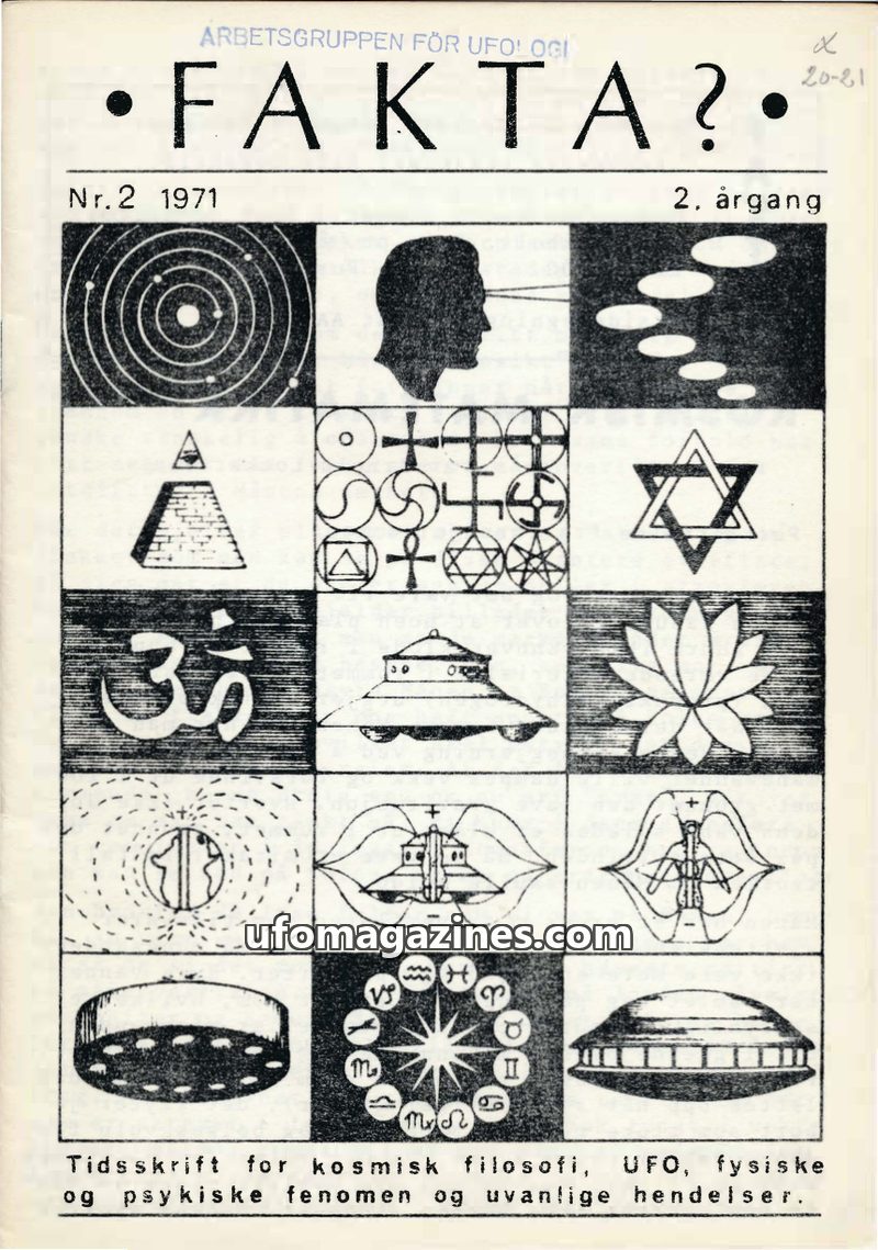 This first issue of 'Fakta ?' is a Norwegian magazine dedicated to cosmic philosophy, UFOs, psychic phenomena, and extraordinary observations. It operates unprofitably and relies o