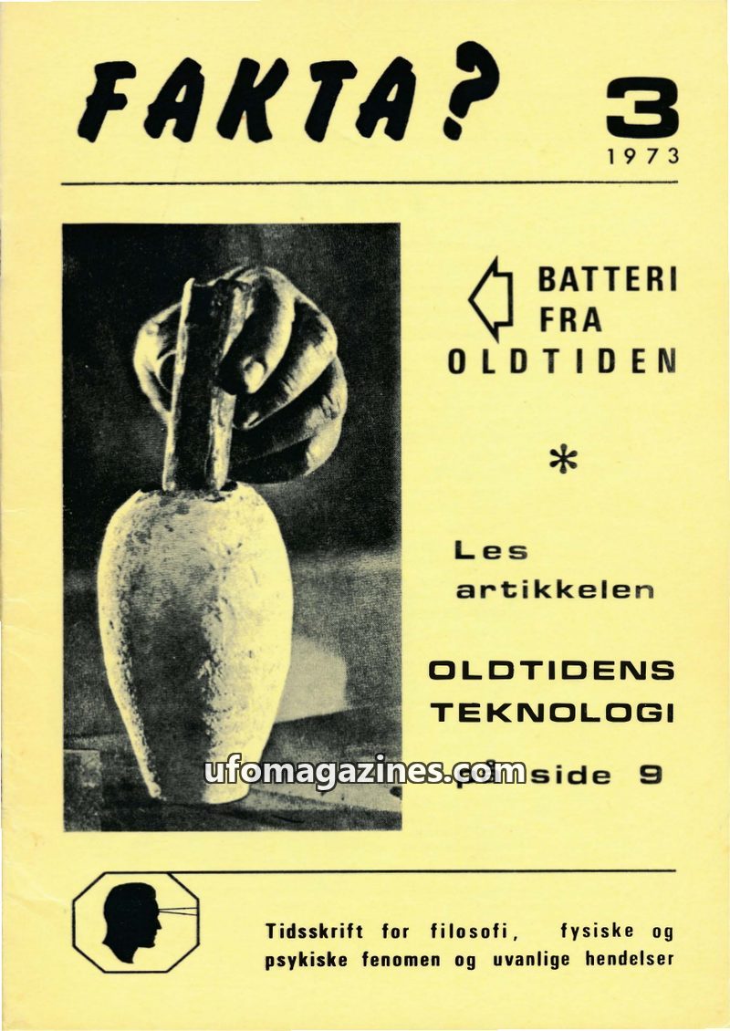This issue of FAKTA? magazine from 1973 delves into ancient technologies, with a cover story on 'Batteries from Antiquity' and an article on 'Ancient Technology' by Ronald J. Willi