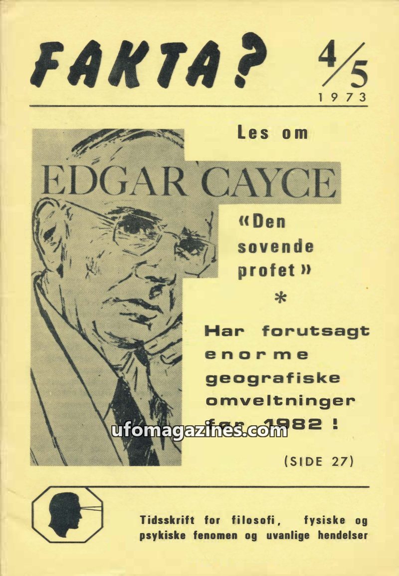 This issue of FAKTA? magazine from 1973 includes an article on Edgar Cayce and his predictions of geographical changes by 1982. It features an interview with Professor Ian Stevenso