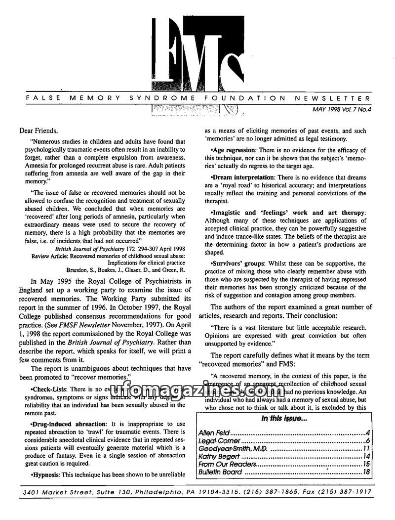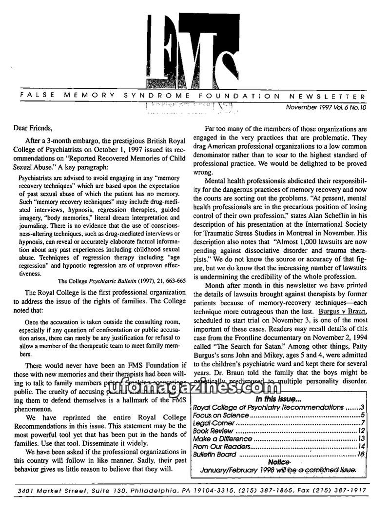 This issue of the FMSF Newsletter highlights the Royal College of Psychiatrists' critical recommendations against 'memory recovery techniques' for child sexual abuse, emphasizing t
