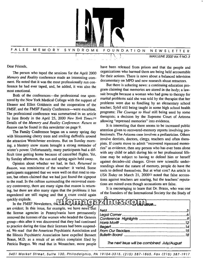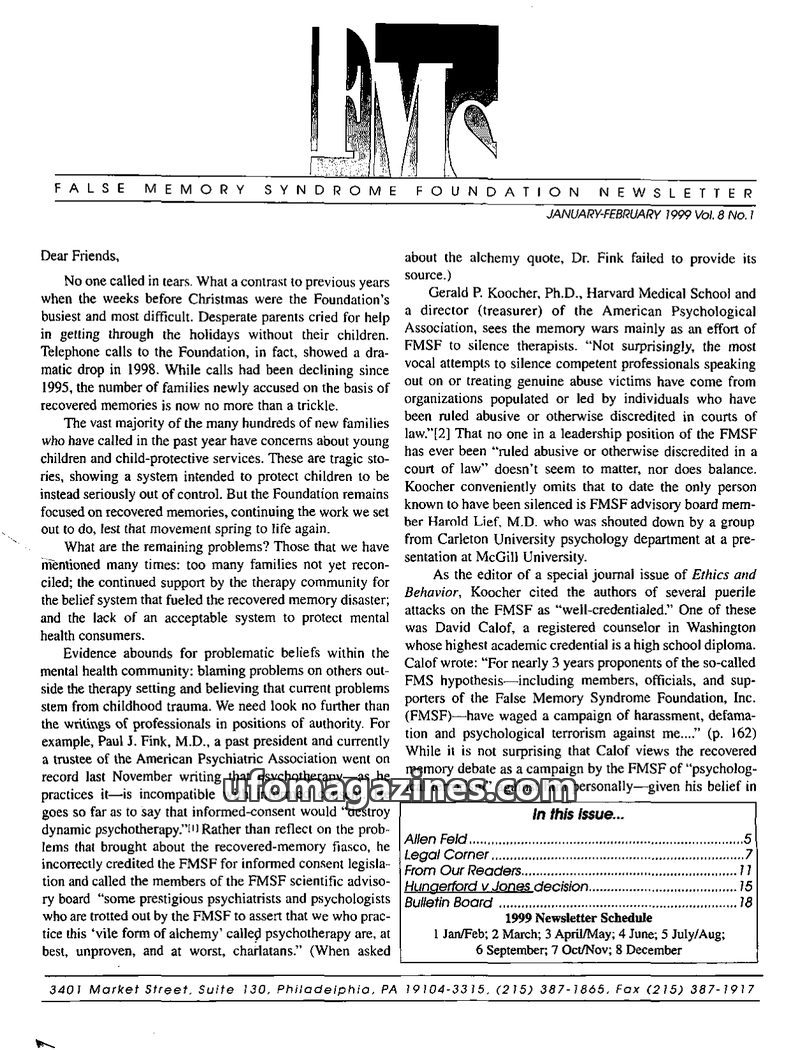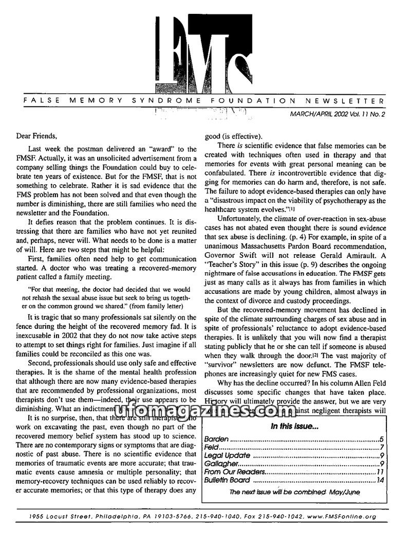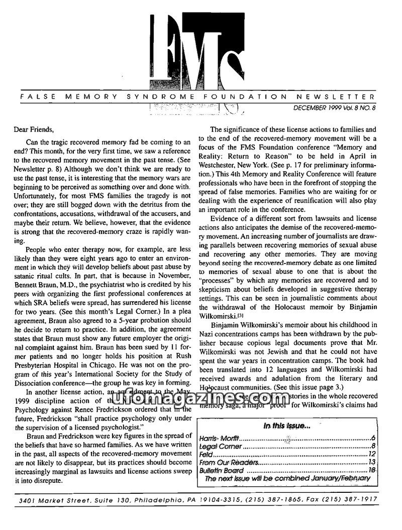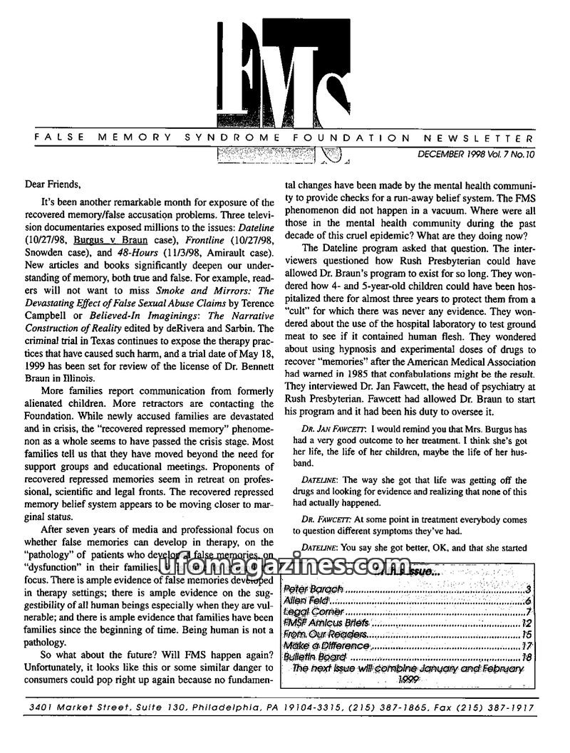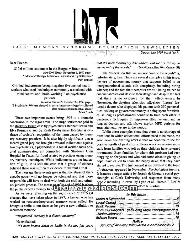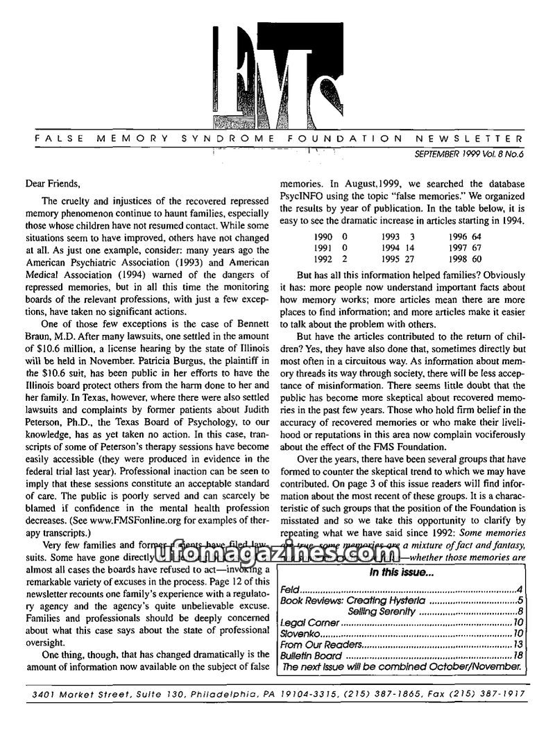 This issue of the FMS Foundation Newsletter focuses on the ongoing debate surrounding false memory syndrome and its implications for psychotherapy and professional education. It hi
