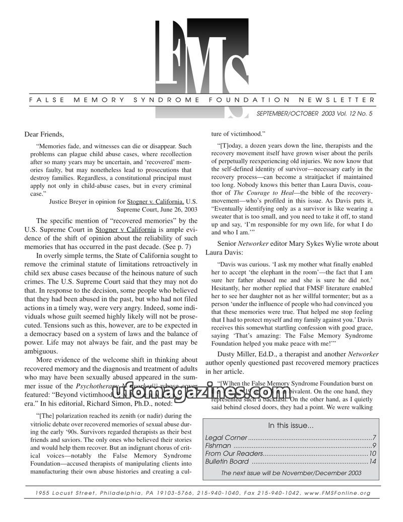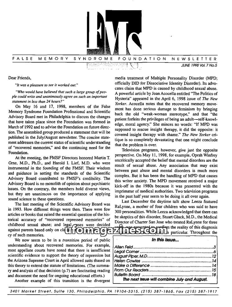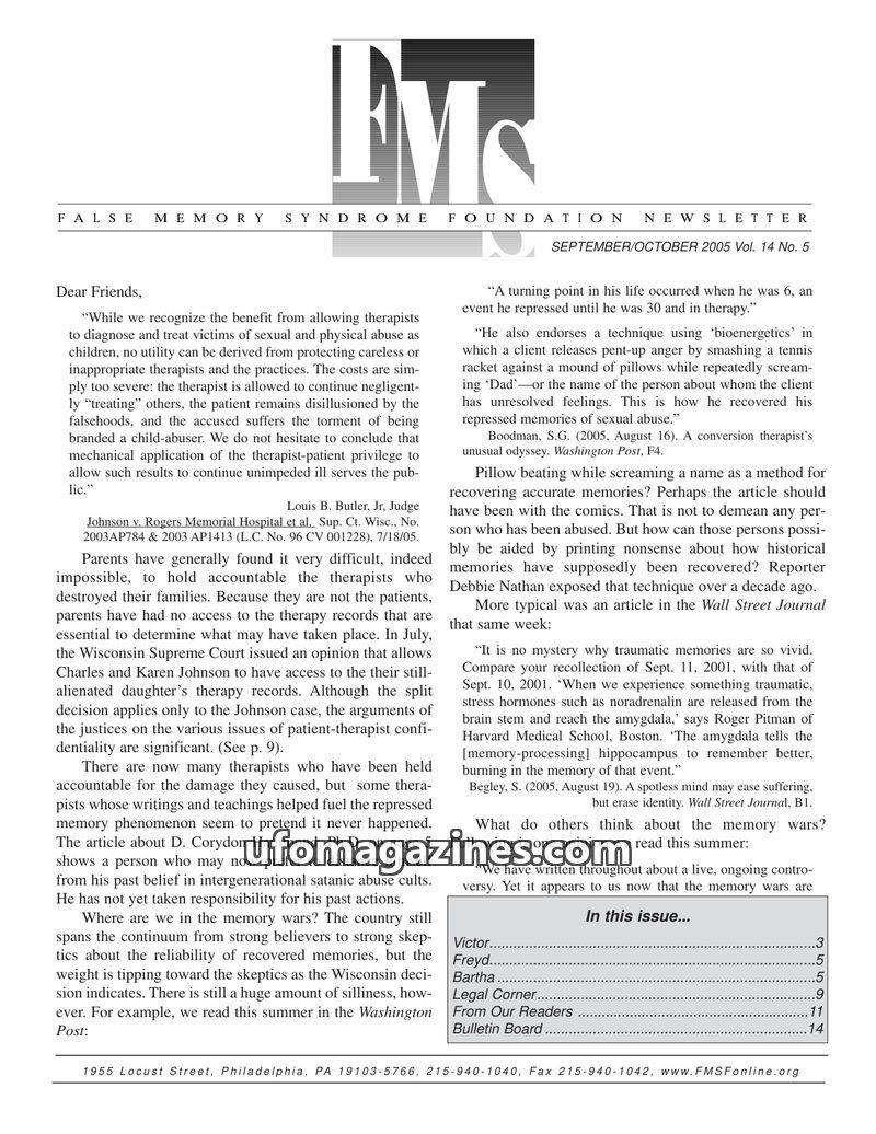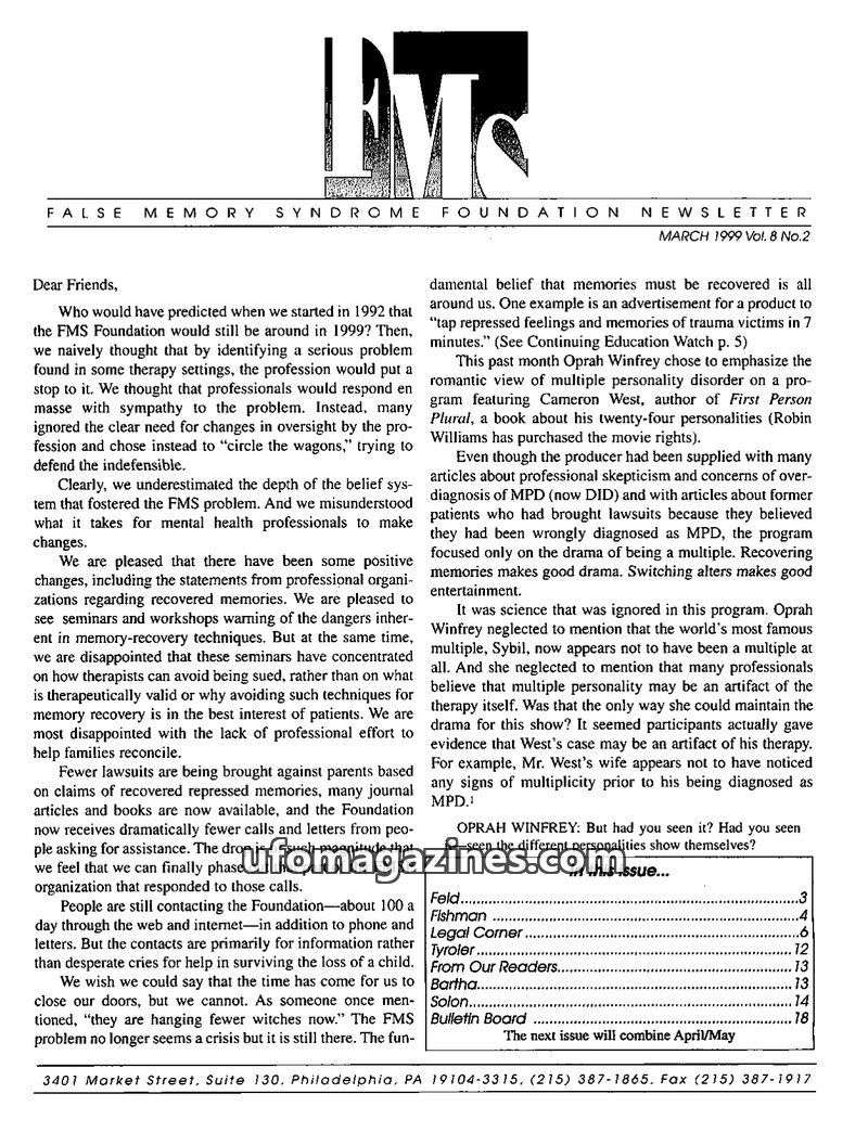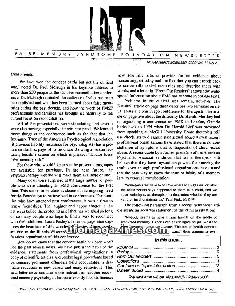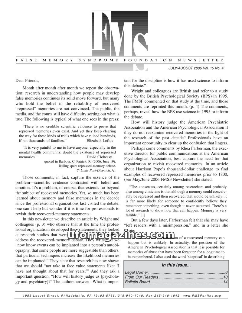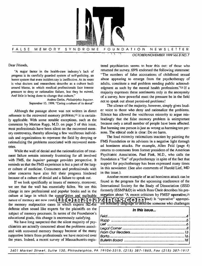 This issue of the FMS Foundation Newsletter focuses on the ongoing debate surrounding false memory syndrome and its implications for psychotherapy and professional education. It hi