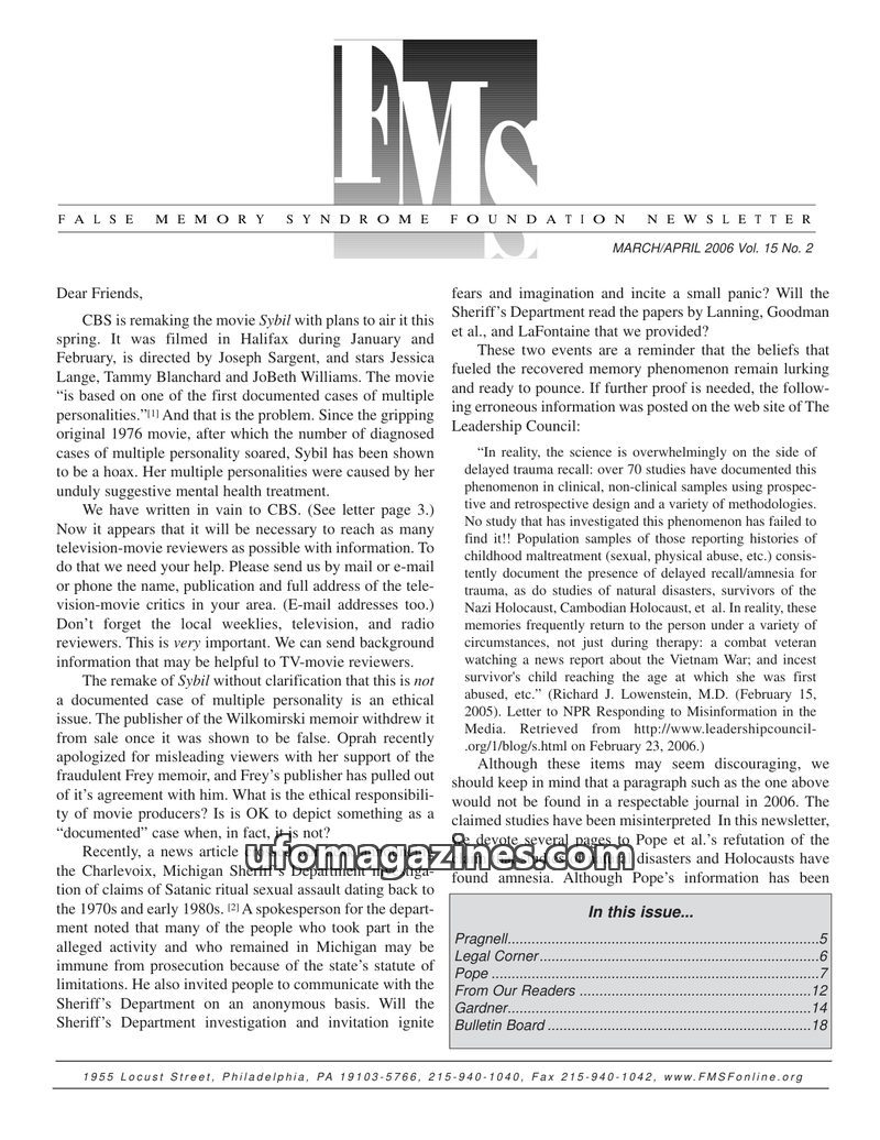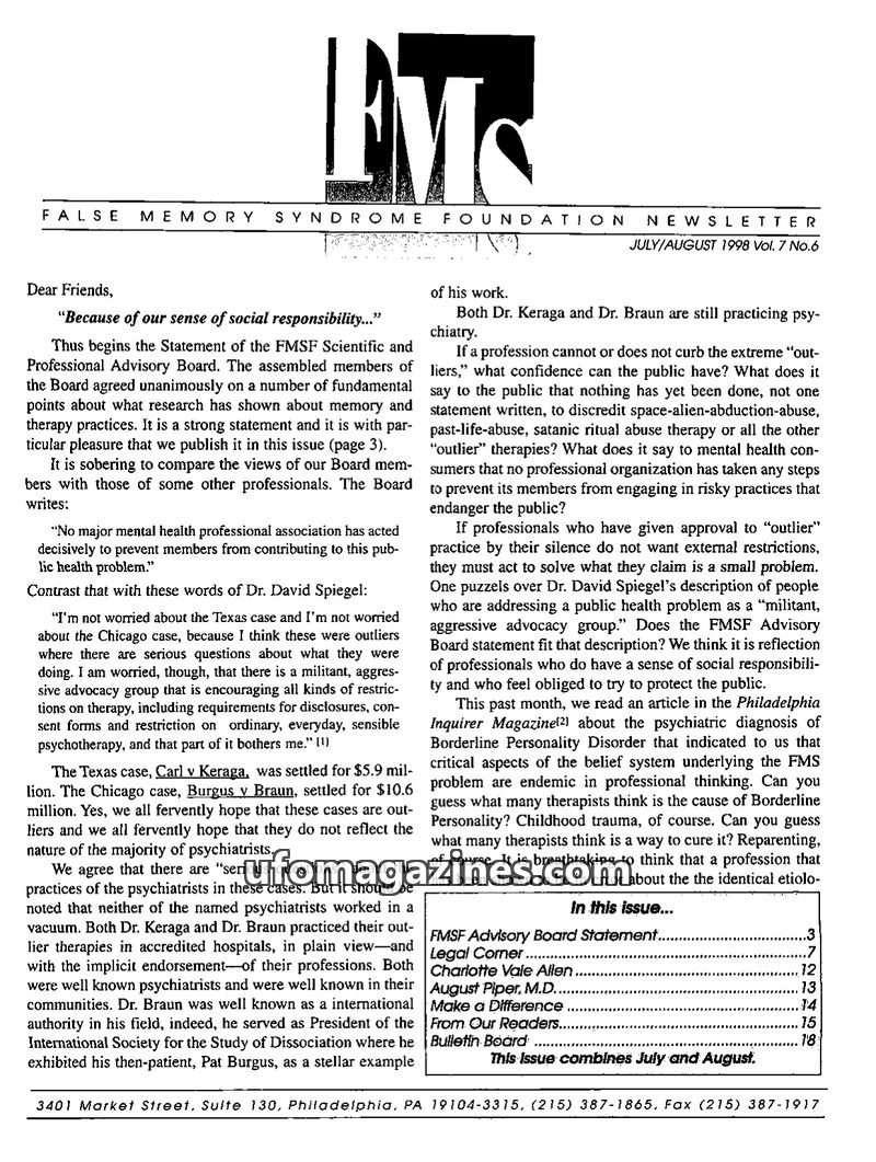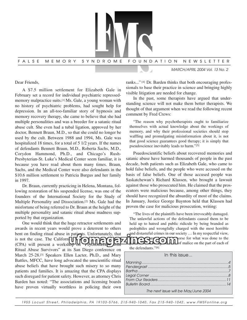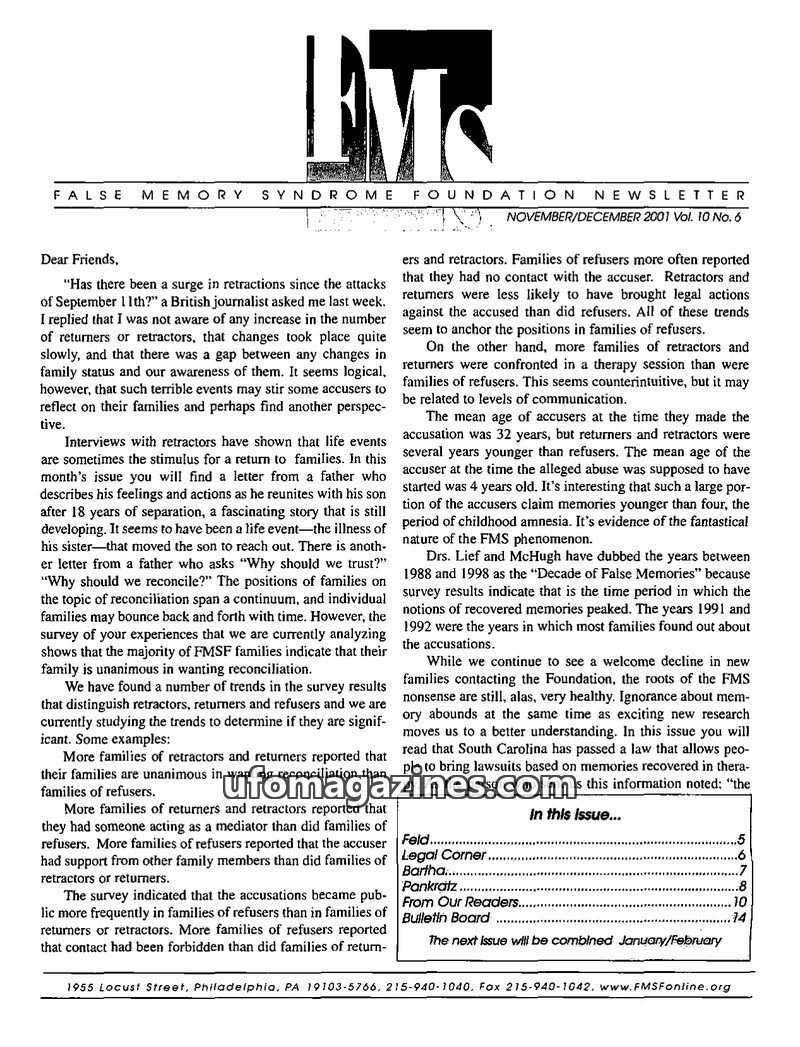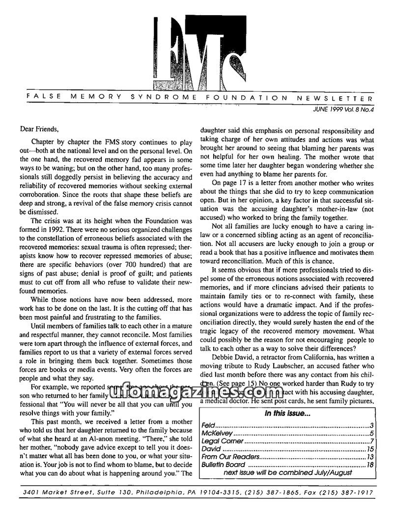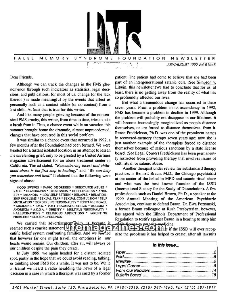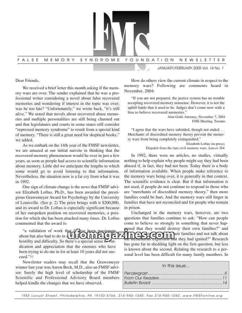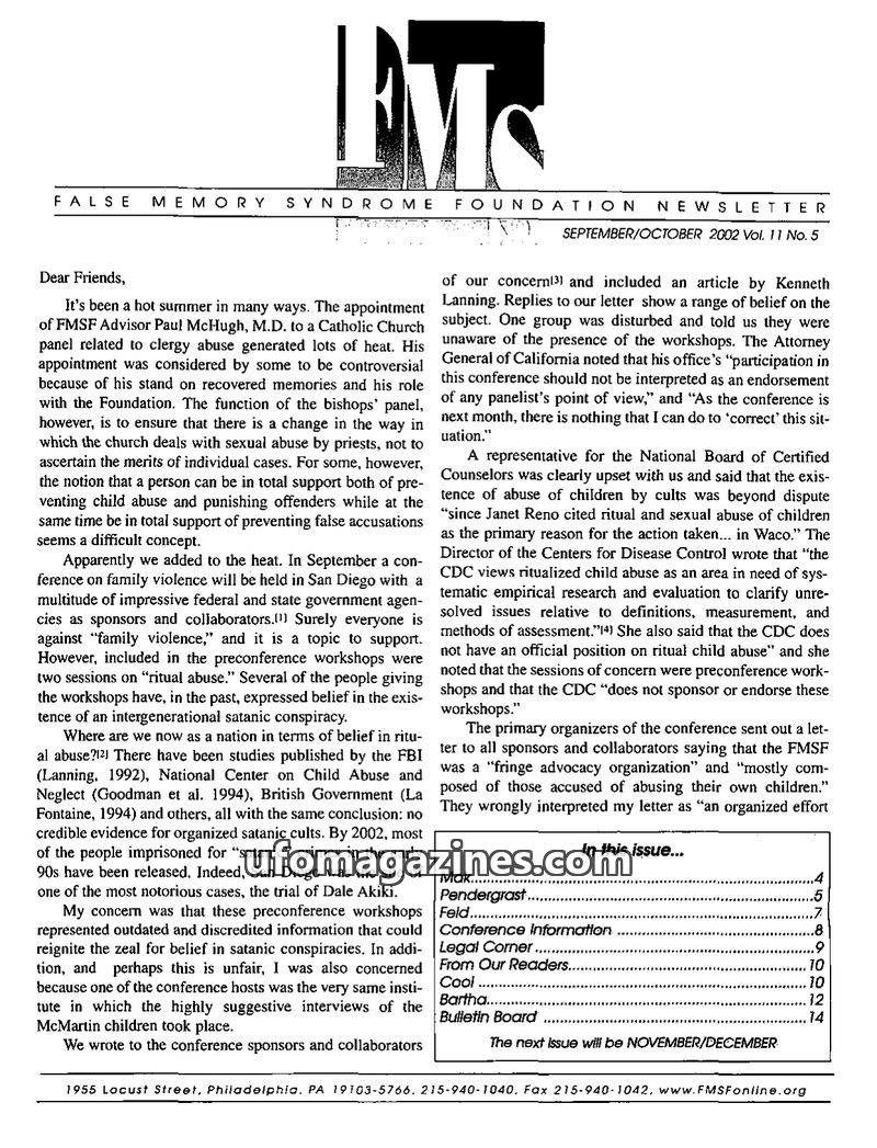 This issue of the FMS Foundation Newsletter focuses on the ongoing debate surrounding false memory syndrome and its implications for psychotherapy and professional education. It hi