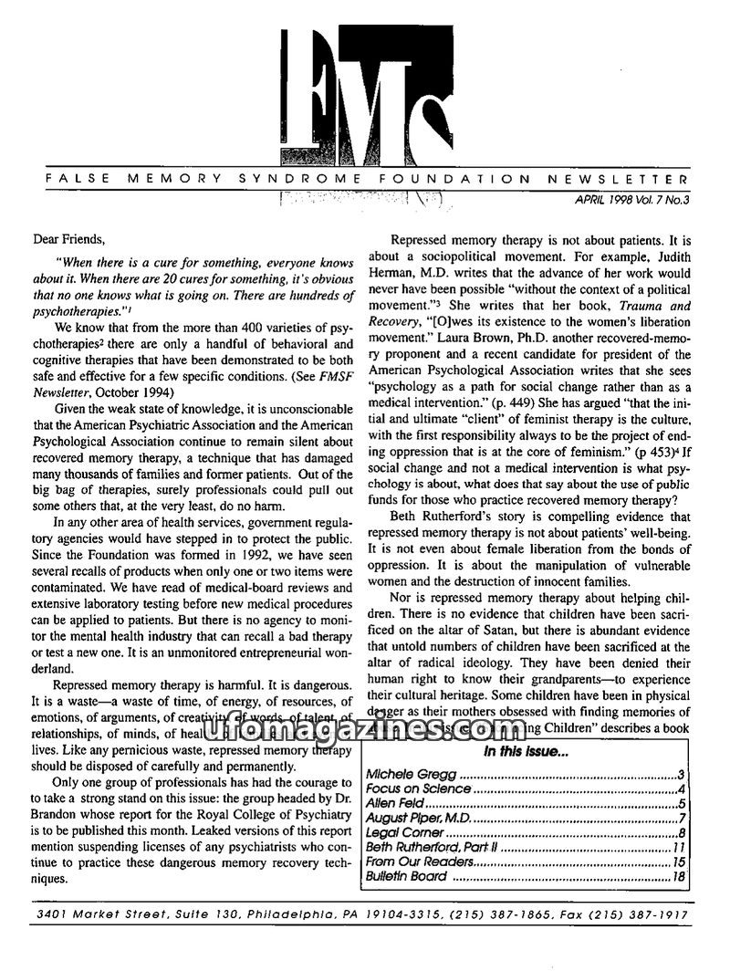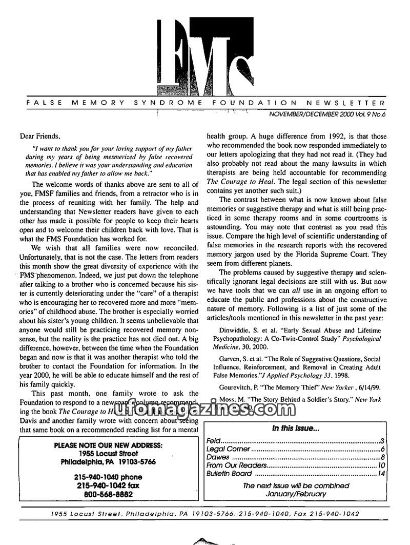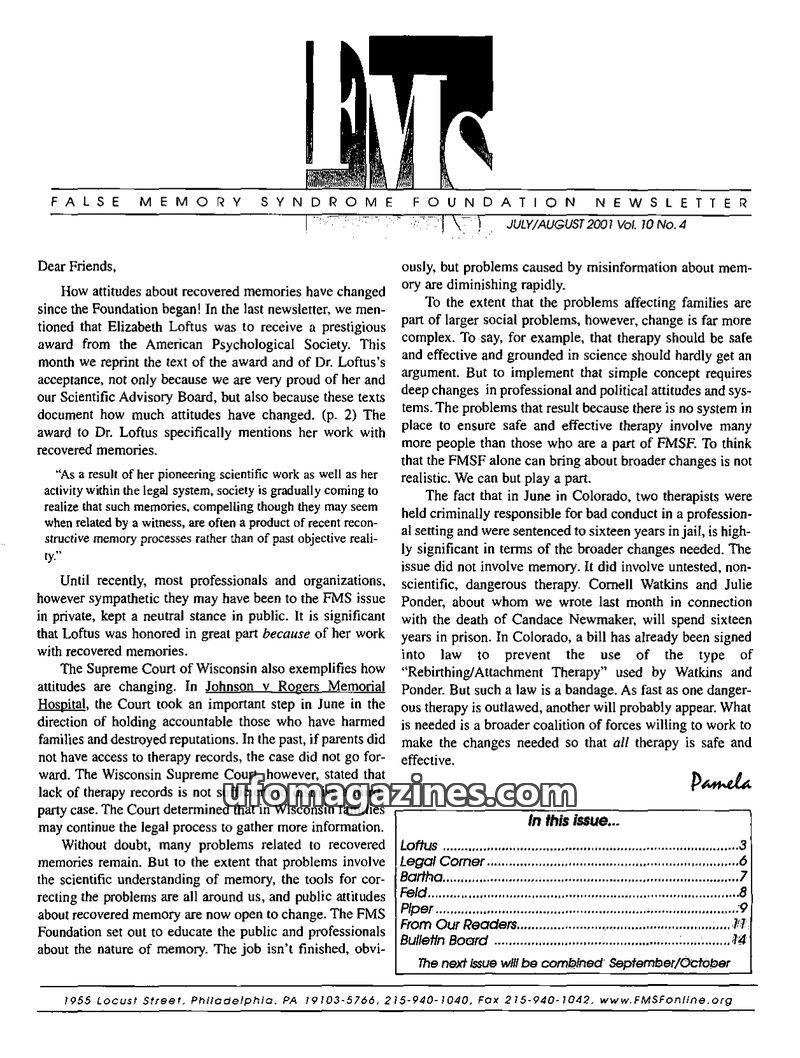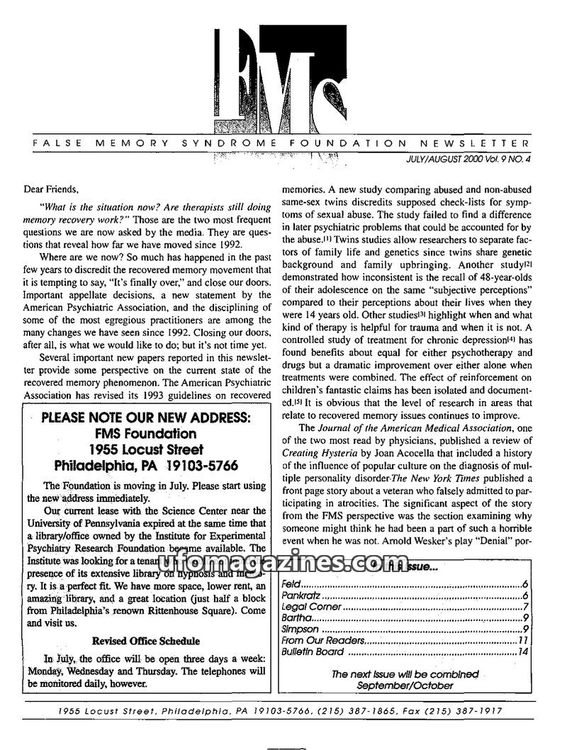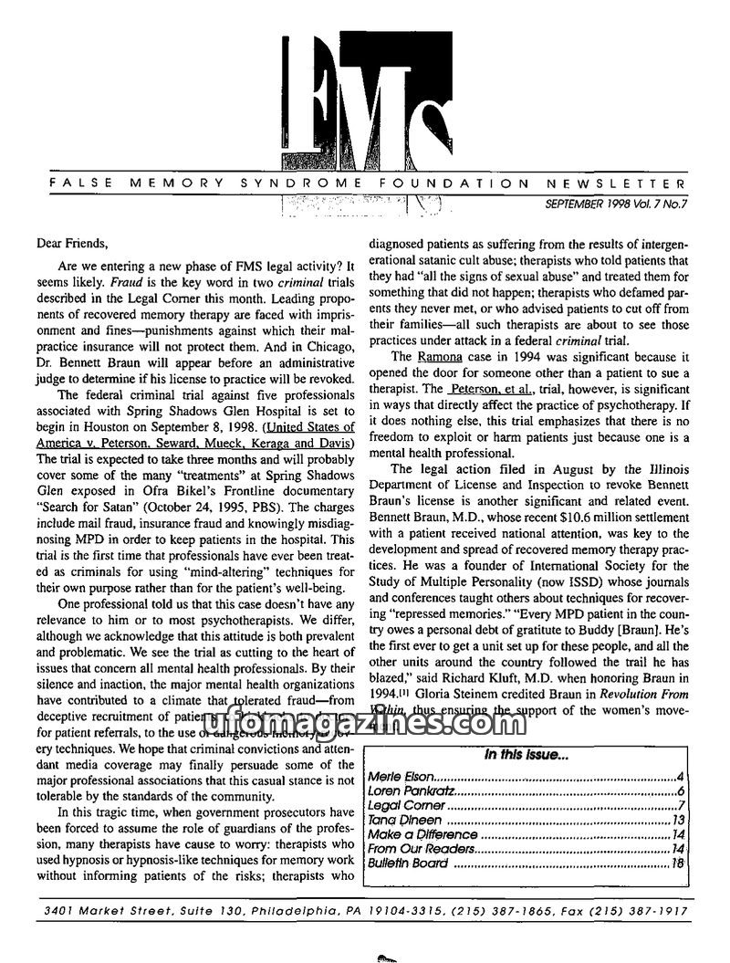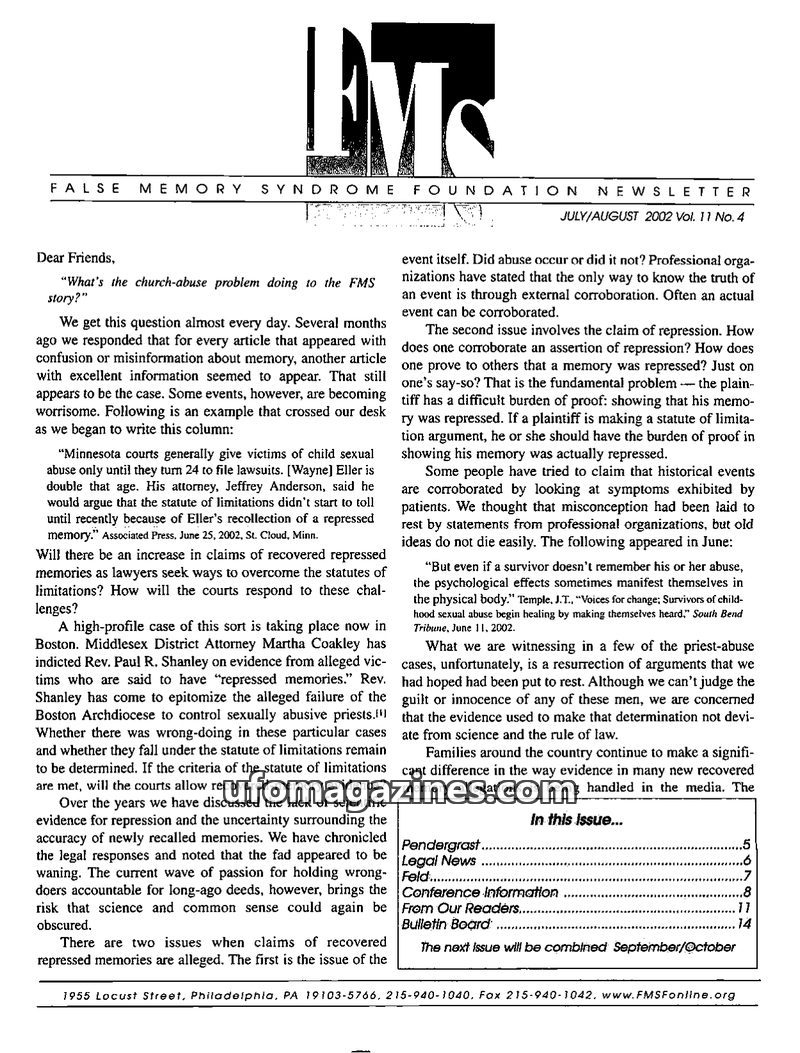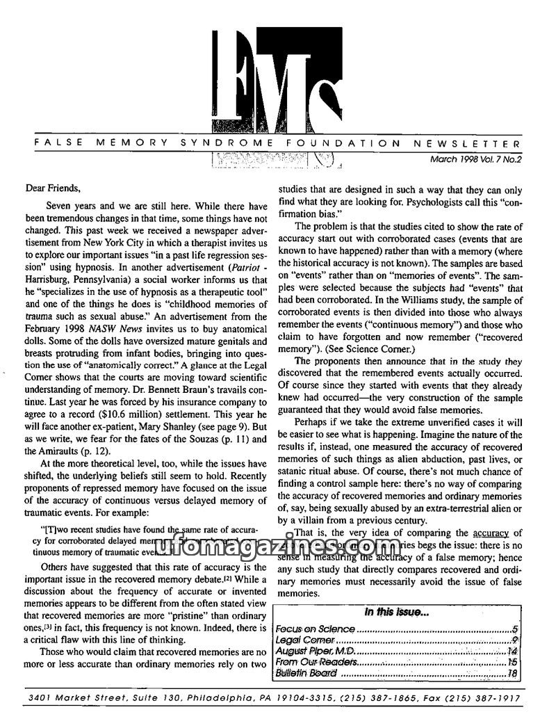 This issue of the FMS Foundation Newsletter focuses on the ongoing debate surrounding false memory syndrome and its implications for psychotherapy and professional education. It hi