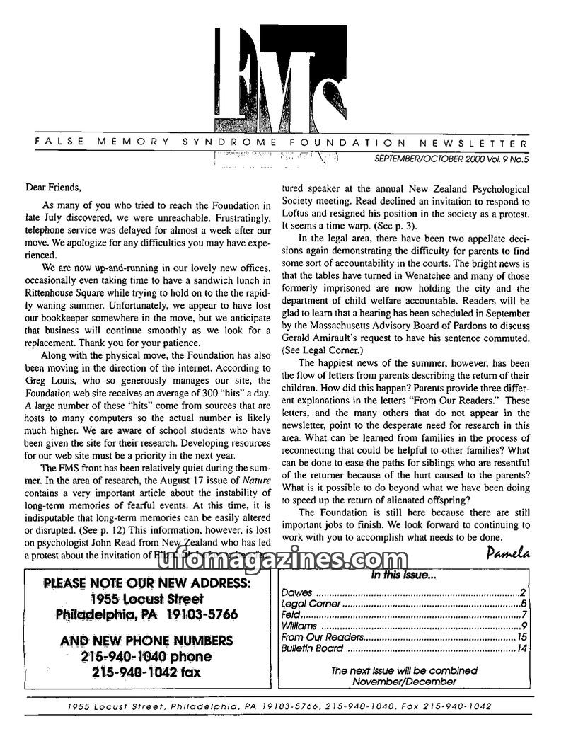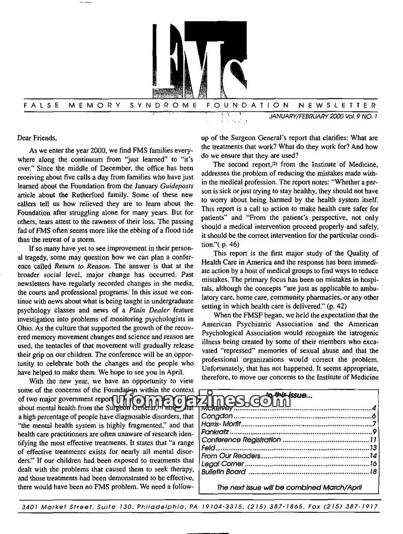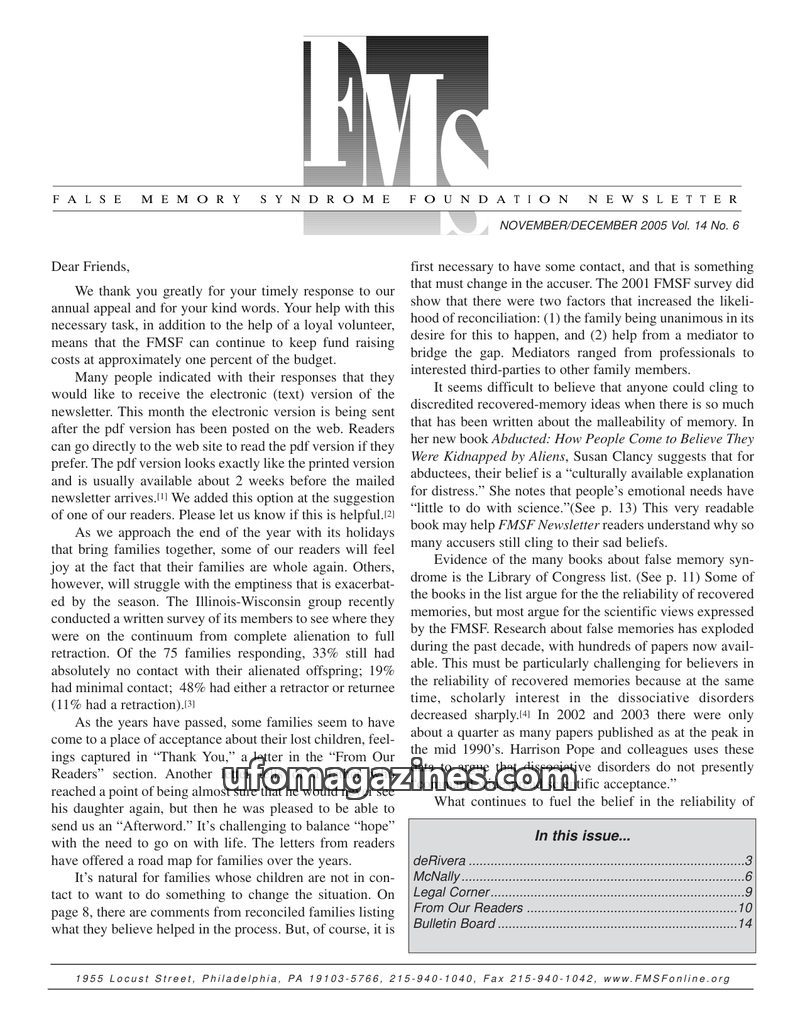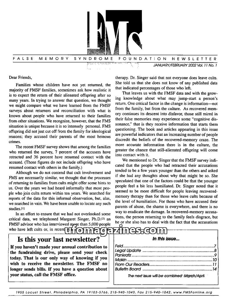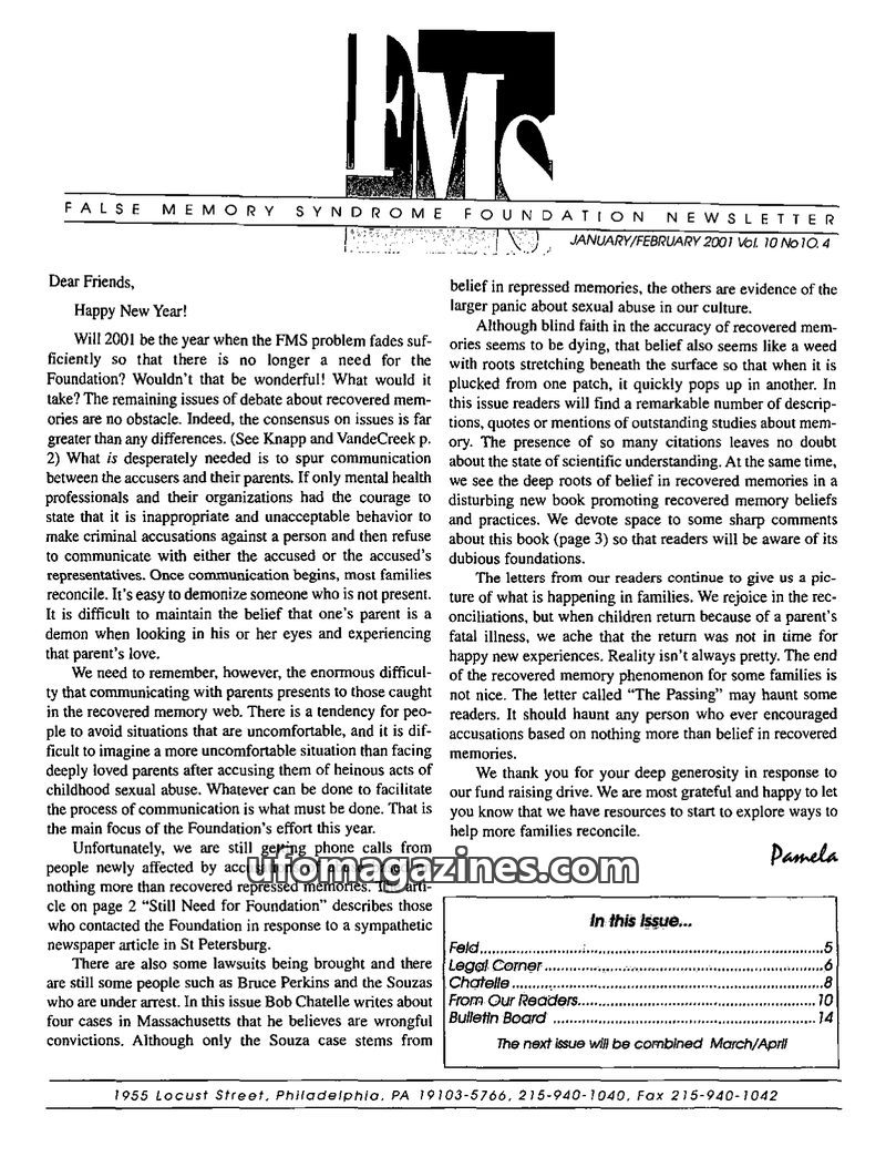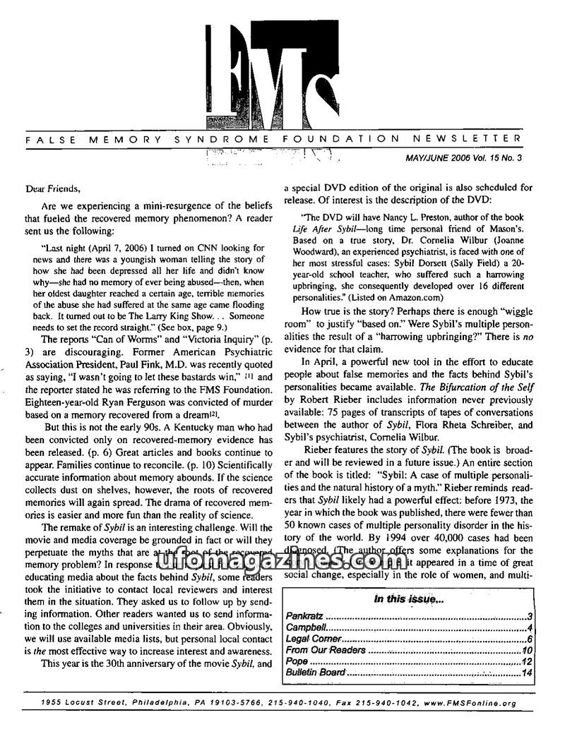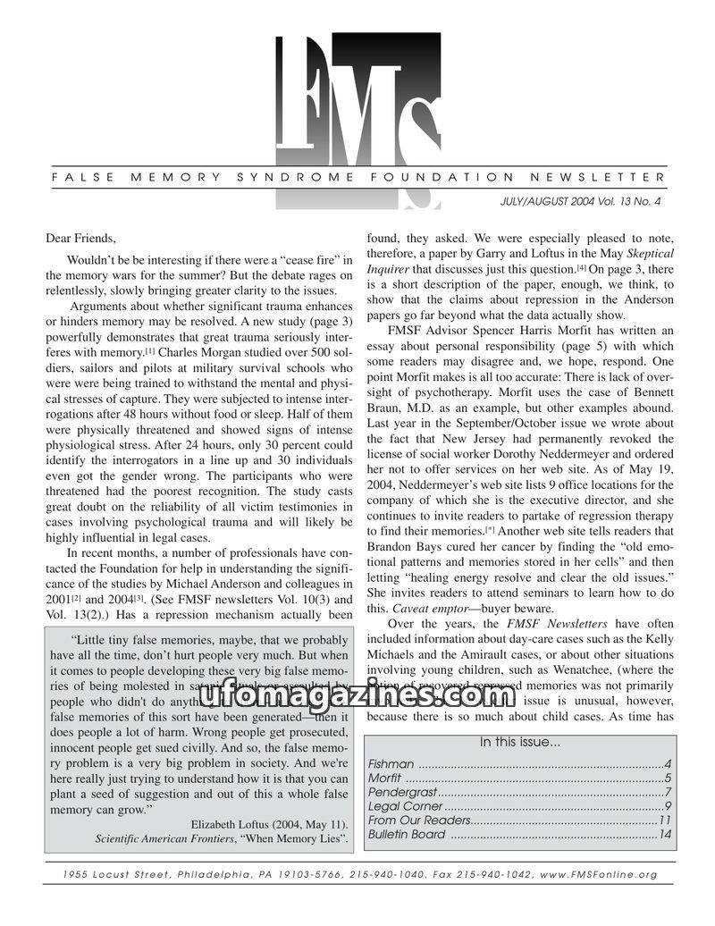 This issue of the FMS Foundation Newsletter focuses on the ongoing debate surrounding false memory syndrome and its implications for psychotherapy and professional education. It hi
