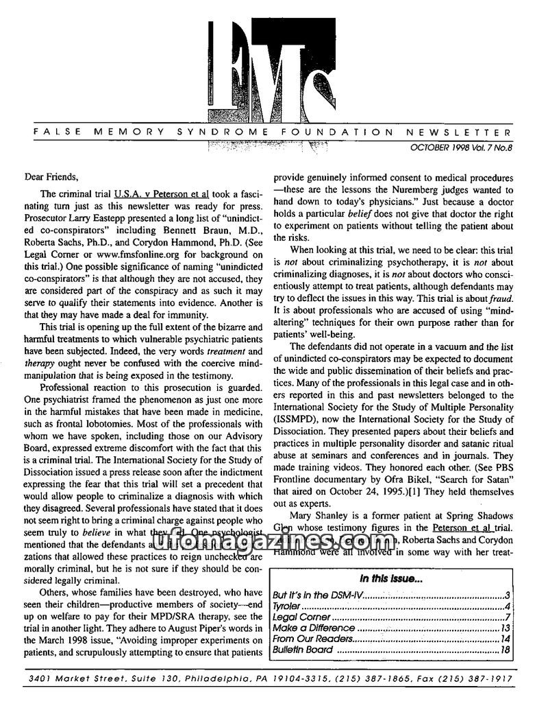 This issue of the FMSF Newsletter focuses on the criminal trial U.S.A. v. Peterson et al., which alleges psychotherapists implanted false memories of satanic ritual abuse. It criti