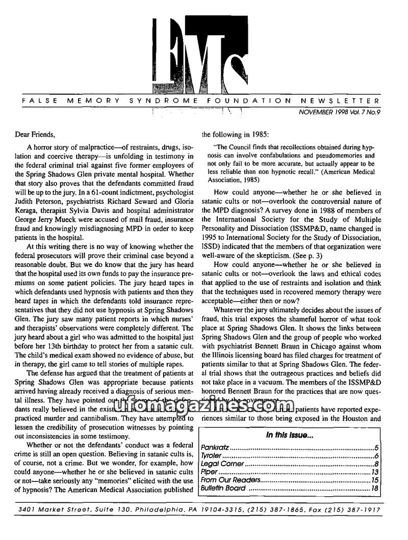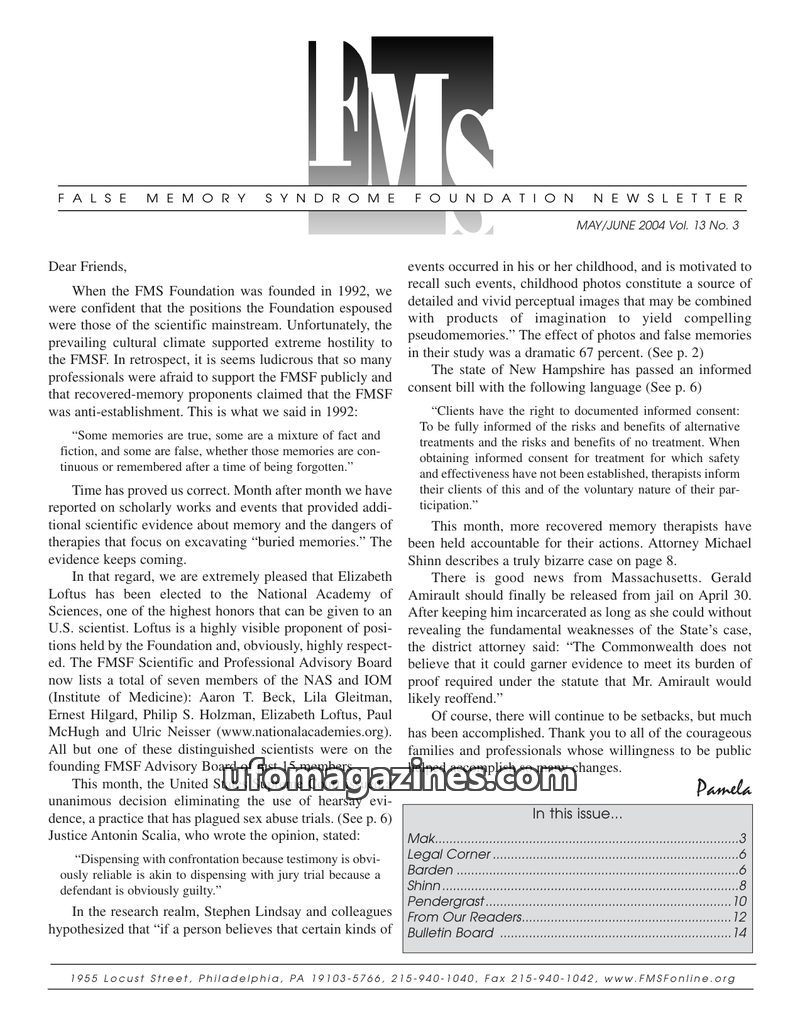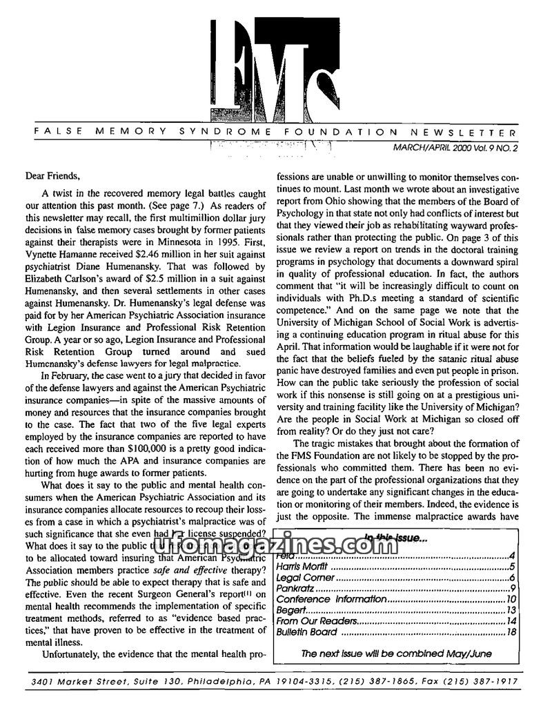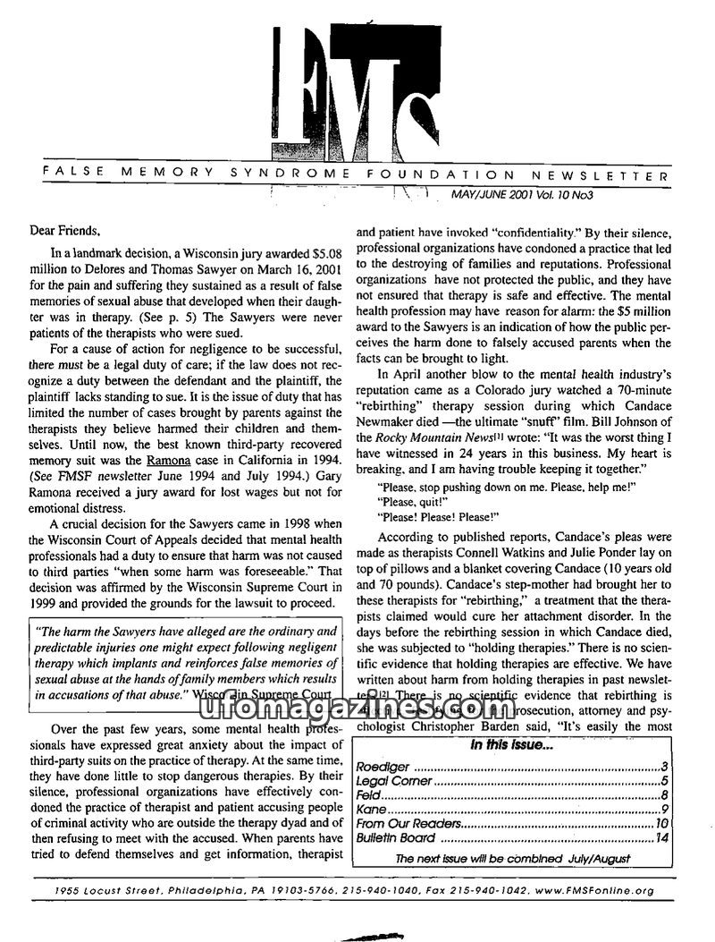 This issue of the FMS Foundation Newsletter highlights the ongoing legal battles surrounding false memory syndrome, including a jury verdict in favor of defense lawyers against ins
