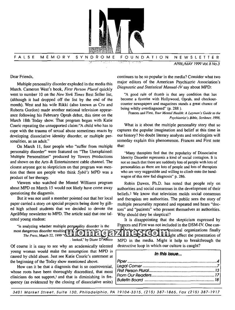This issue of the FMSF Newsletter critically examines the media's fascination with Multiple Personality Disorder (MPD), questioning its popularity despite a lack of scientific supp