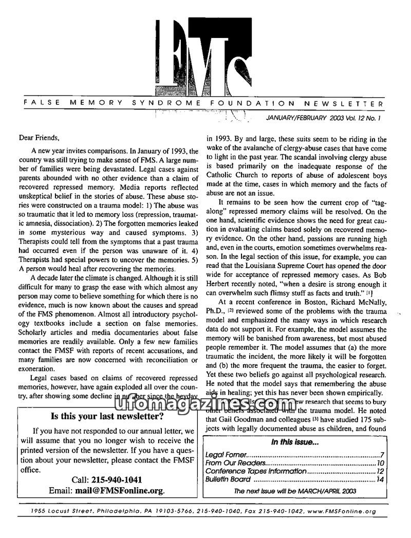 This issue of the FMSF Newsletter highlights the continued relevance of the false memory syndrome, noting that families still need support despite a decrease in cases. It emphasize