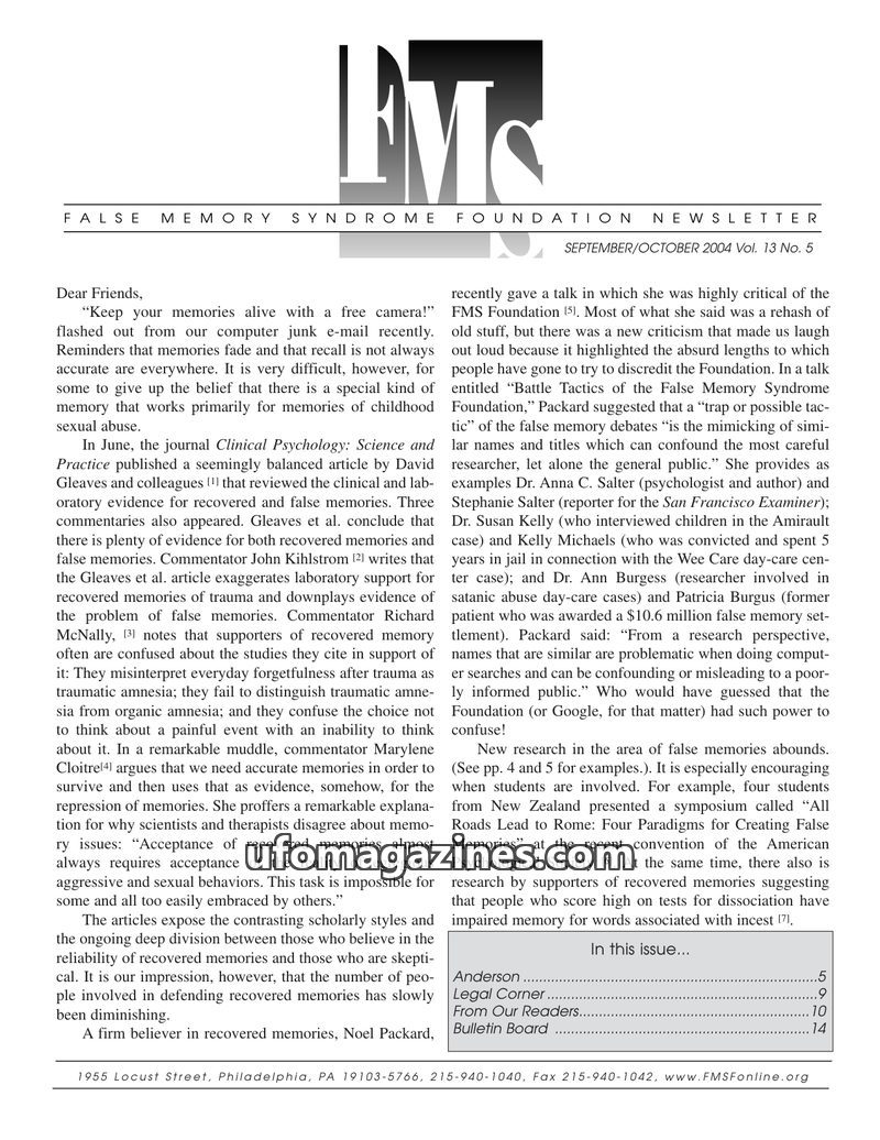 This issue of the False Memory Syndrome Foundation Newsletter (Nov/Dec 2004) addresses the ongoing challenges posed by false memory syndrome, noting its inclusion in dictionaries a