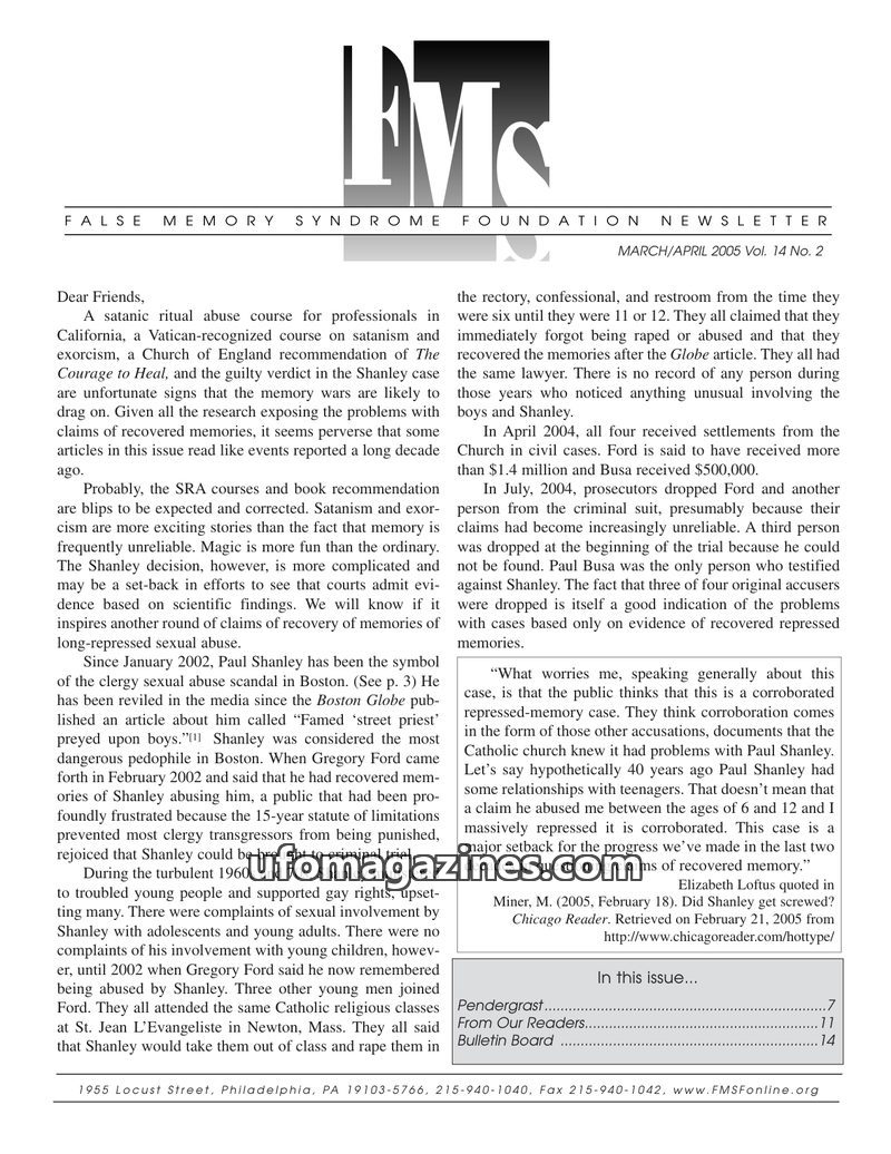 This issue of the FMSF Newsletter focuses heavily on the Paul Shanley case, a defrocked priest convicted of sexual abuse based on recovered memories. It discusses the legal proceed