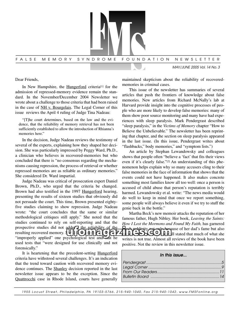 This issue of the FMSF Newsletter focuses on the legal and scientific challenges surrounding repressed and recovered memories. The 'Legal Corner' details a New Hampshire court's ru