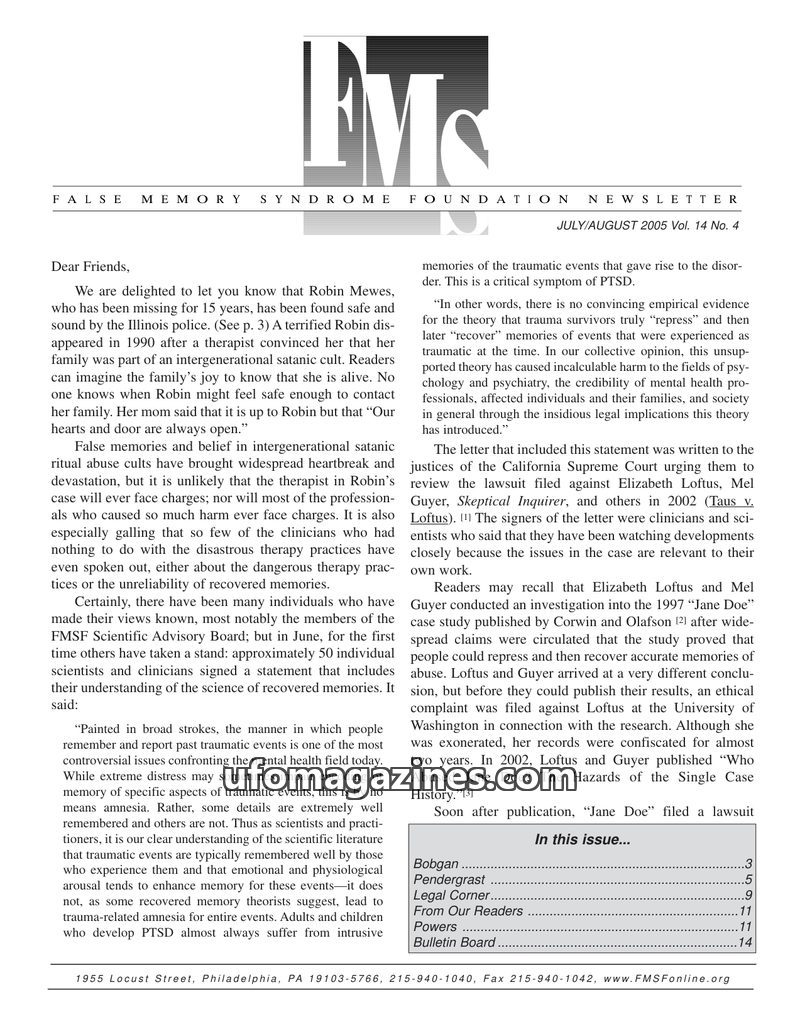This issue of the FMSF Newsletter reports on the safe return of Robin Mewes after 15 years, highlighting the dangers of recovered memory therapy. It features a statement from scien