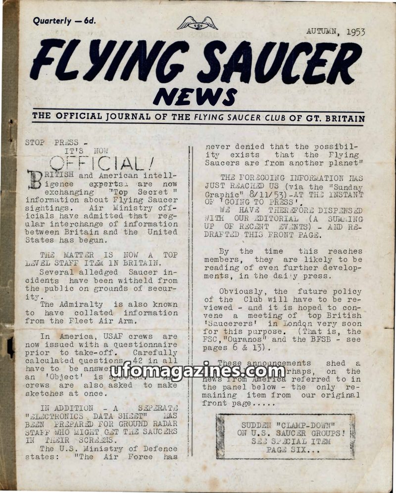 The Autumn 1953 issue of Flying Saucer News reports that British and American intelligence experts are officially exchanging 'Top Secret' information on Flying Saucer sightings, wi