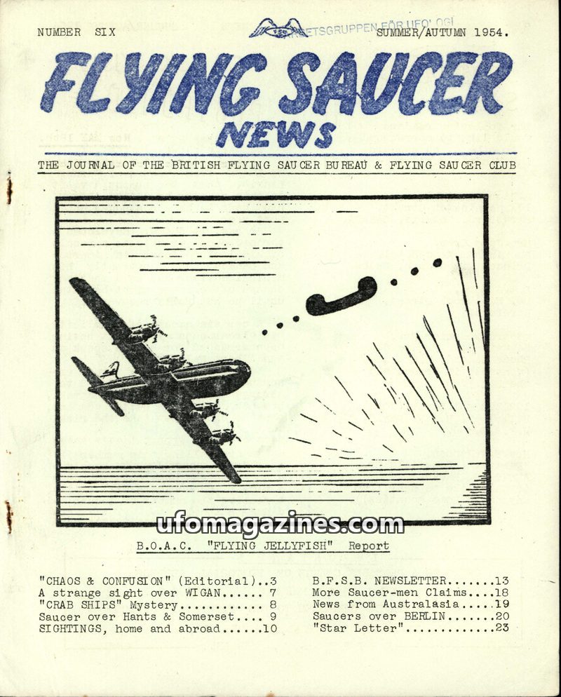 This issue of Flying Saucer News from Summer/Autumn 1954 covers the highly publicized B.O.A.C. 'Flying Jellyfish' incident, detailing witness accounts and official responses. It al