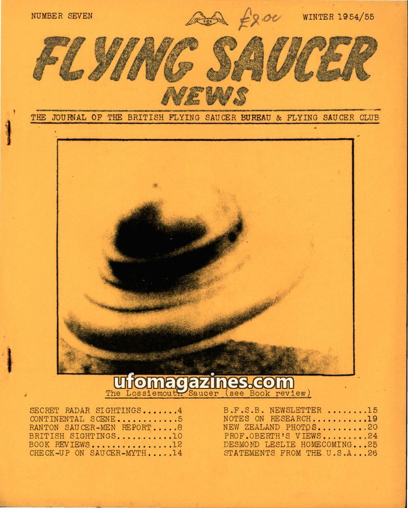 This issue of Flying Saucer News from Winter 1953/54 covers a surge in UFO sightings following a 'Great Radar and Balloon Episode'. It details numerous reports from across Britain,