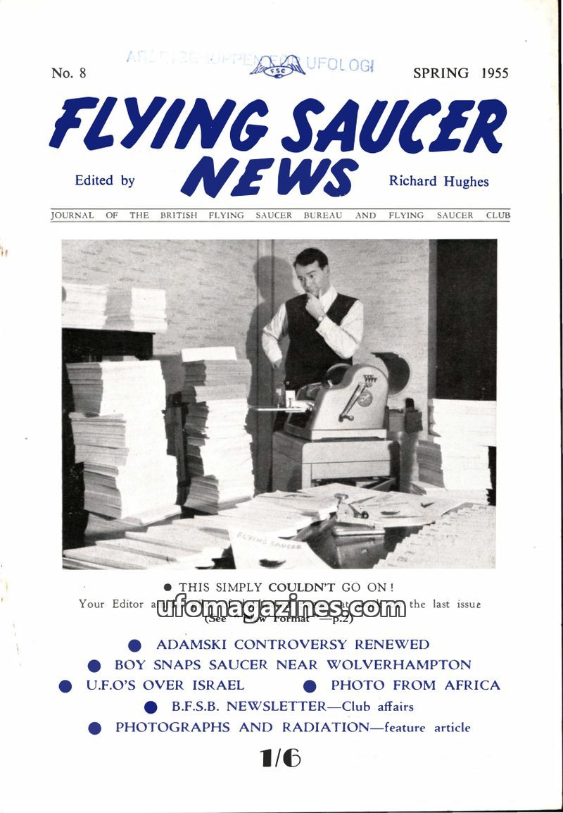 This issue of Flying Saucer News, dated Spring 1955, announces a new 'letterpress' format and wider public sale. It delves into the renewed controversy surrounding George Adamski's