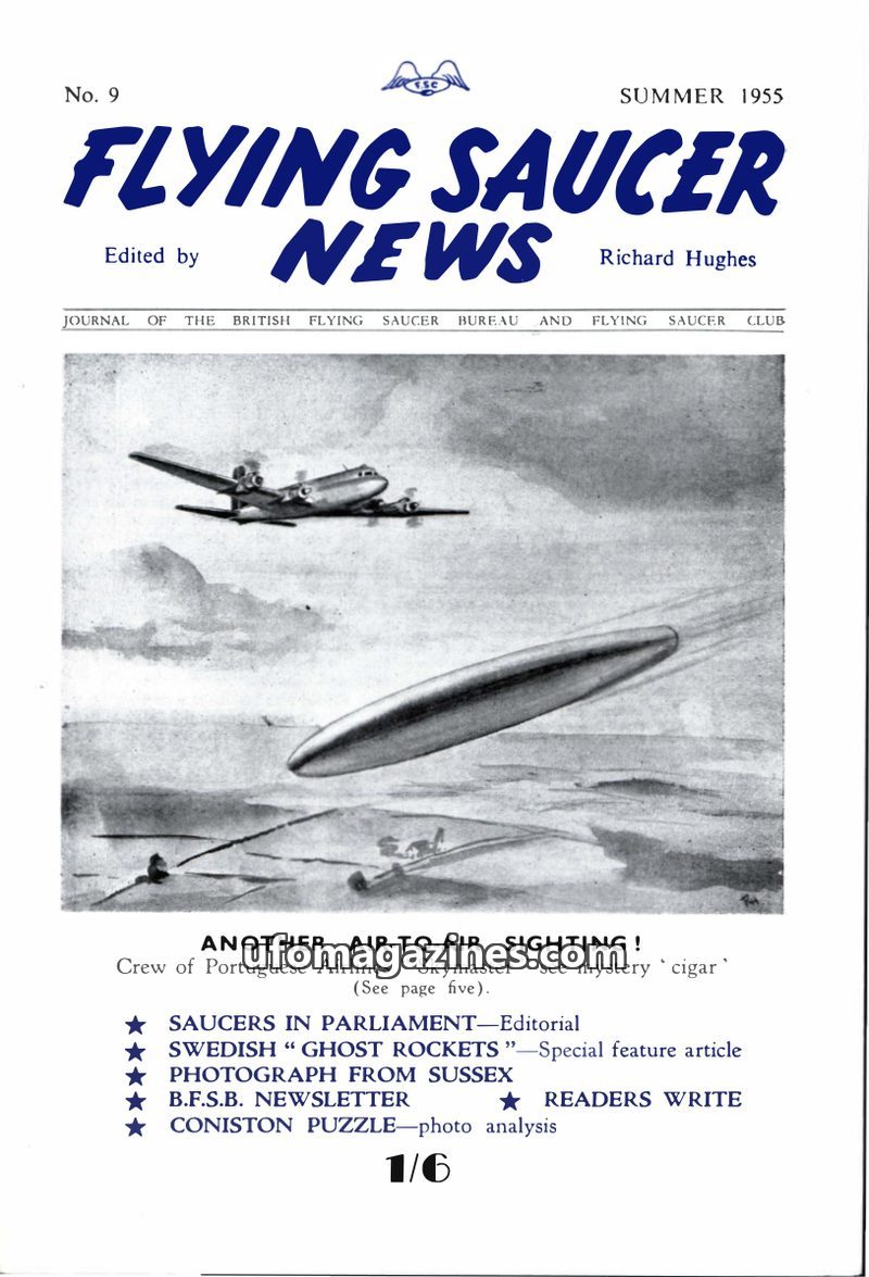 This issue of Flying Saucer News covers a variety of UFO-related topics. A lead article details an air-to-air sighting by a Portuguese Airlines crew. An editorial discusses the Bri