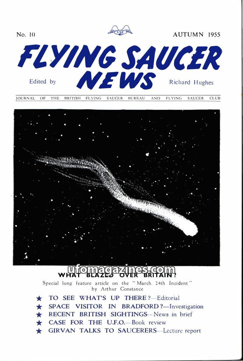 This issue of Flying Saucer News from Autumn 1955 focuses heavily on the 'March 24th Incident' over Britain, featuring a detailed article by Arthur Constance. It includes witness a