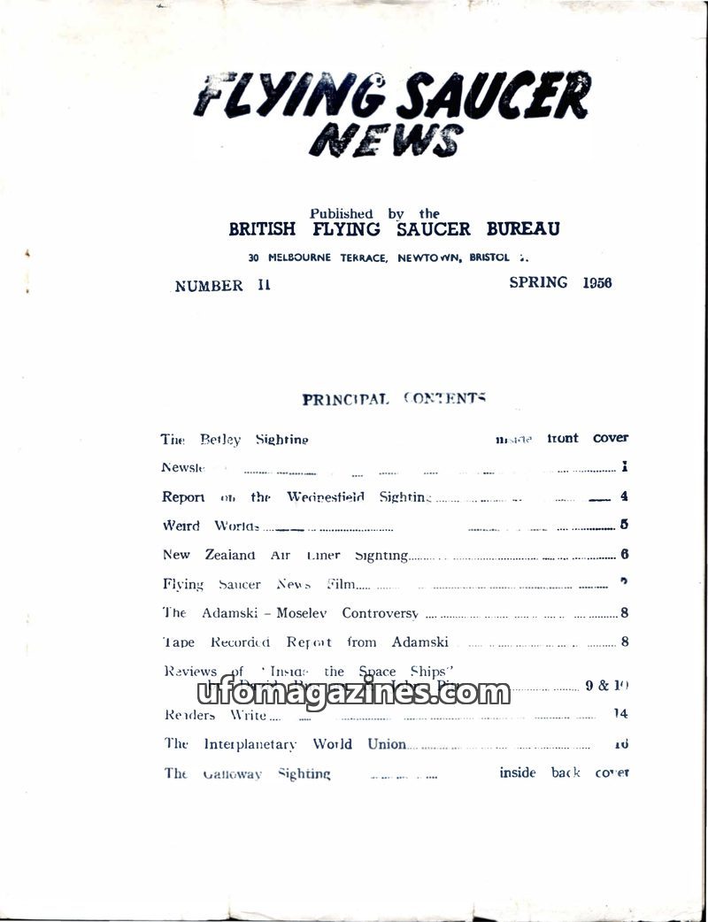 This issue of Flying Saucer News, dated Spring 1956, details various UFO sightings including the Betley Sighting and a New Zealand airliner encounter. It addresses the financial ch