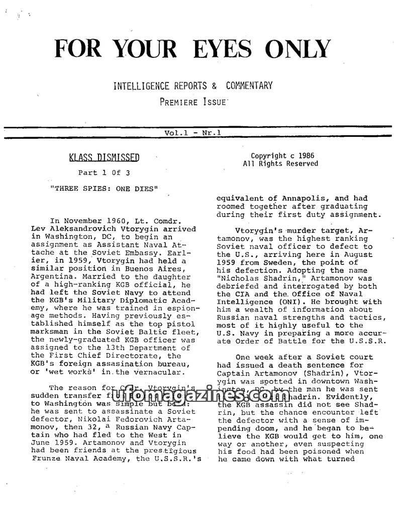 This issue details a complex espionage case involving Lt. Comdr. Lev Aleksandrovich Vtorygin, a KGB assassin sent to eliminate Soviet defector Nikolai Fedorovich Artamonov. The ope