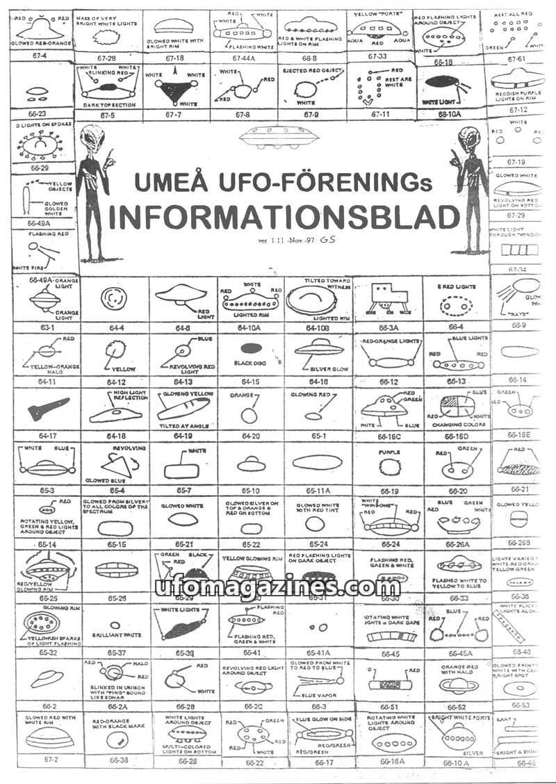 This issue of the Umeå UFO Association's Information Bulletin (Nov 1997) delves into the phenomenon of Unidentified Flying Objects (UFOs). It covers the origin of the term 'UFO' an