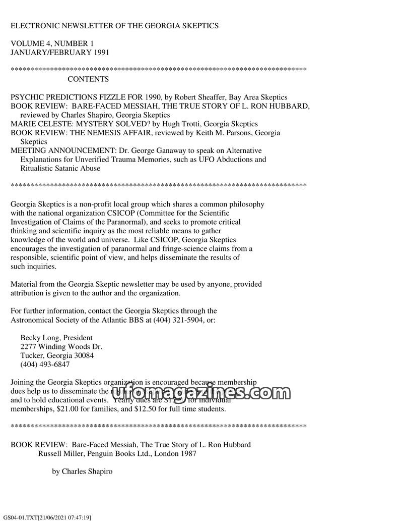 This issue of the Georgia Skeptics newsletter features reviews of 'Bare-Faced Messiah' by Russell Miller, detailing L. Ron Hubbard's life, and 'The Nemesis Affair' by David M. Raup