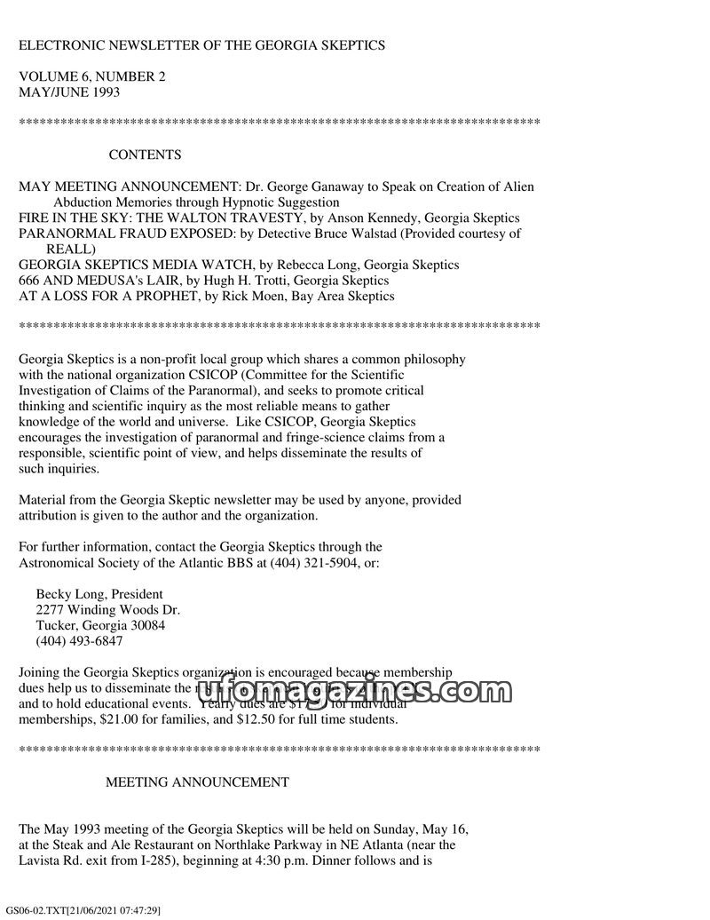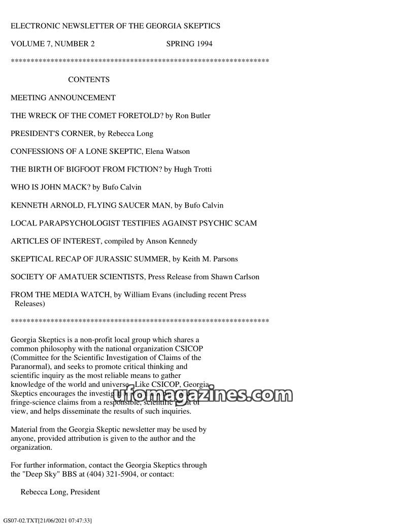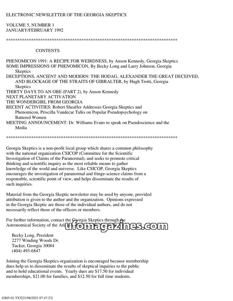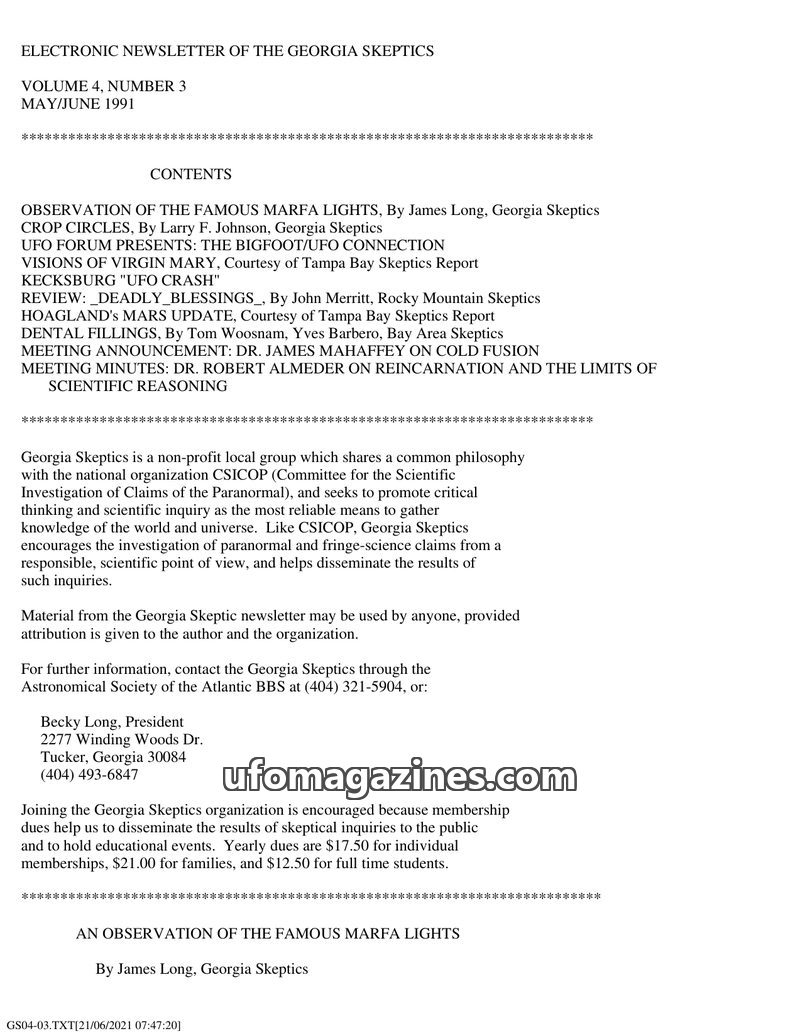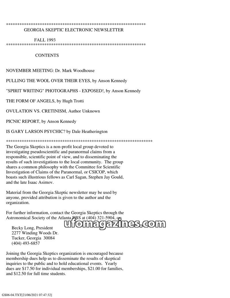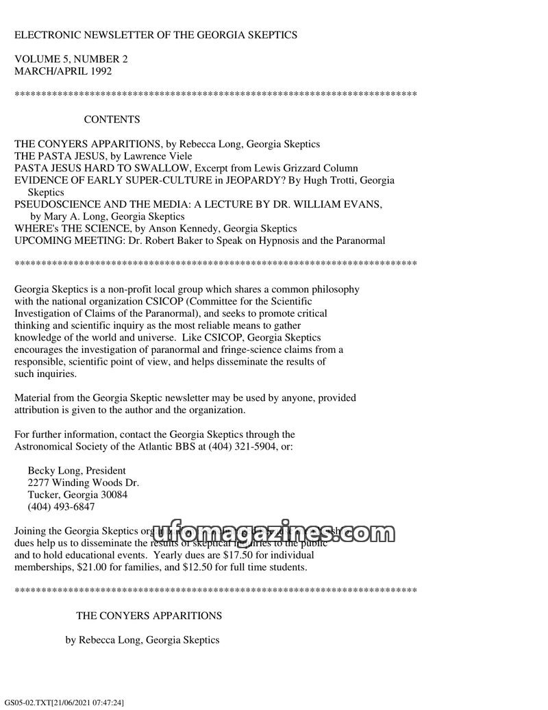 This issue of the Georgia Skeptics newsletter covers a range of topics from UFO sightings to skeptical examinations of alleged paranormal phenomena. The lead article details an obs