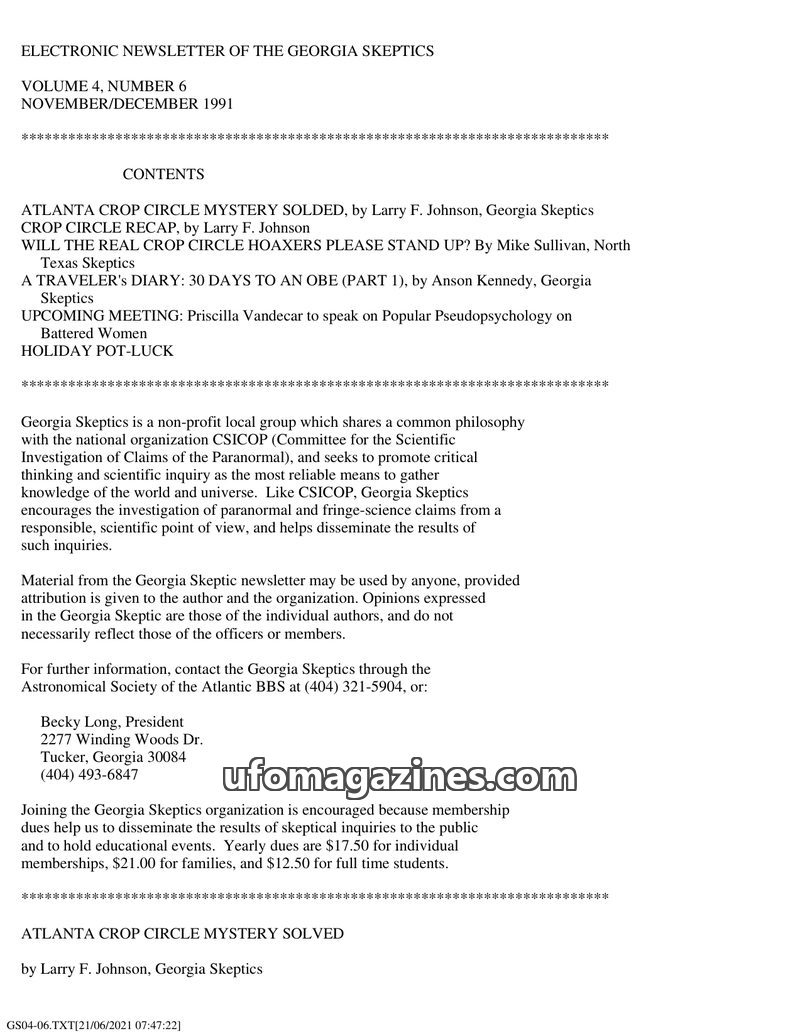 This issue of the Georgia Skeptics newsletter debunks crop circle phenomena, revealing that the Atlanta circles were created by the investigators themselves as a demonstration. It