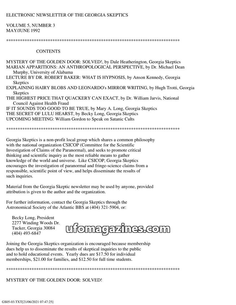 This issue of the Georgia Skeptics newsletter features articles debunking paranormal claims. Dale Heatherington explains the 'Golden Door' photographic anomaly as a camera artifact