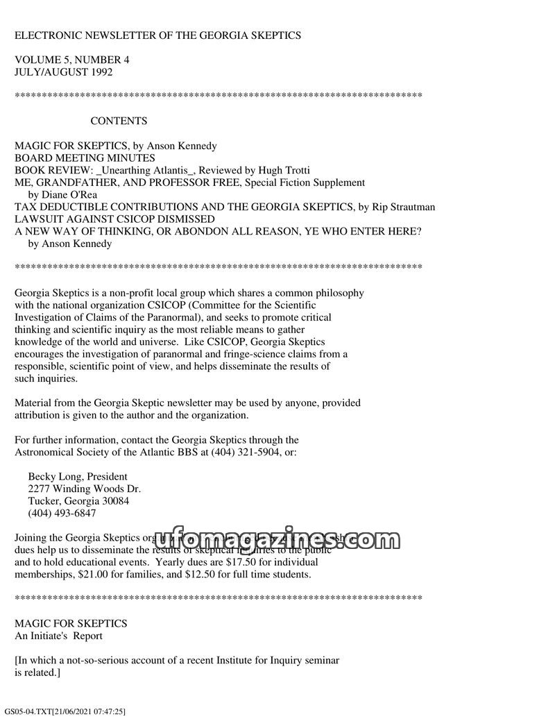 This issue of the Georgia Skeptics newsletter covers a range of topics including a report on a 'Magic for Skeptics' seminar, a book review of 'Unearthing Atlantis: An Archeological