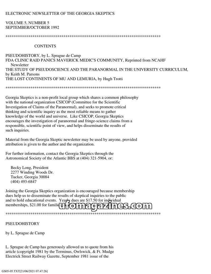 This issue of the Georgia Skeptics newsletter tackles several topics. It features an article by L. Sprague de Camp debunking common pseudohistorical beliefs about ancient Egyptians