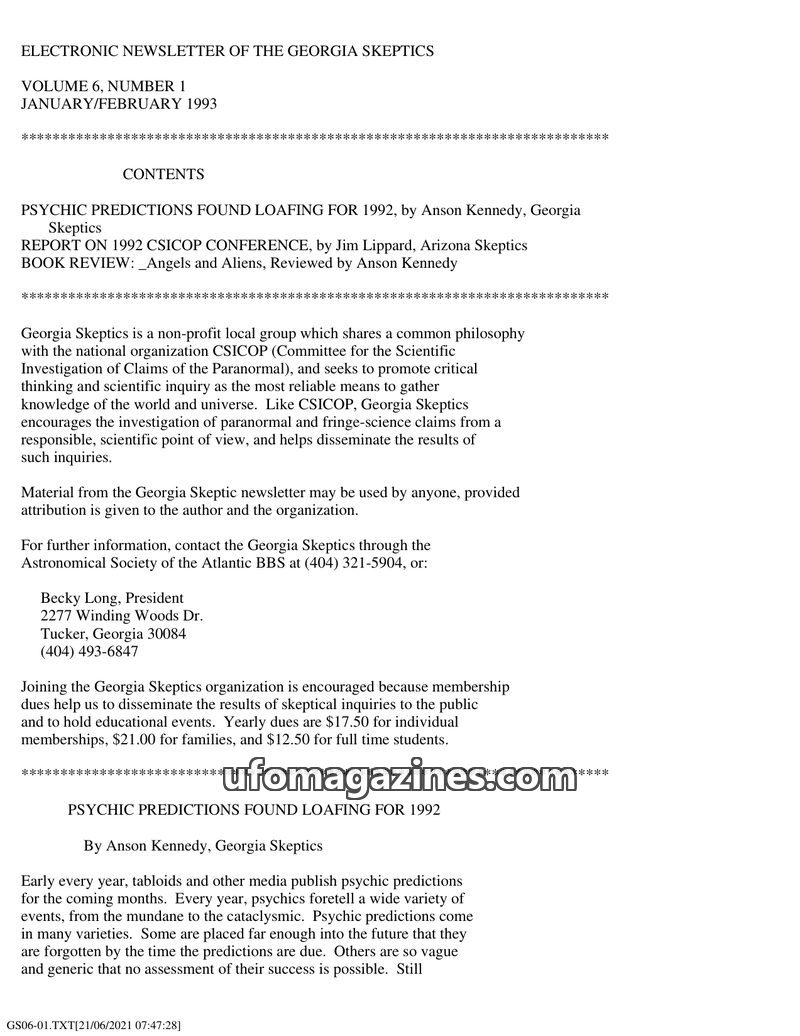 This issue of the Georgia Skeptics newsletter reviews psychic predictions for 1992, finding them largely vague or inaccurate, with a local psychic named Marilyn failing to predict
