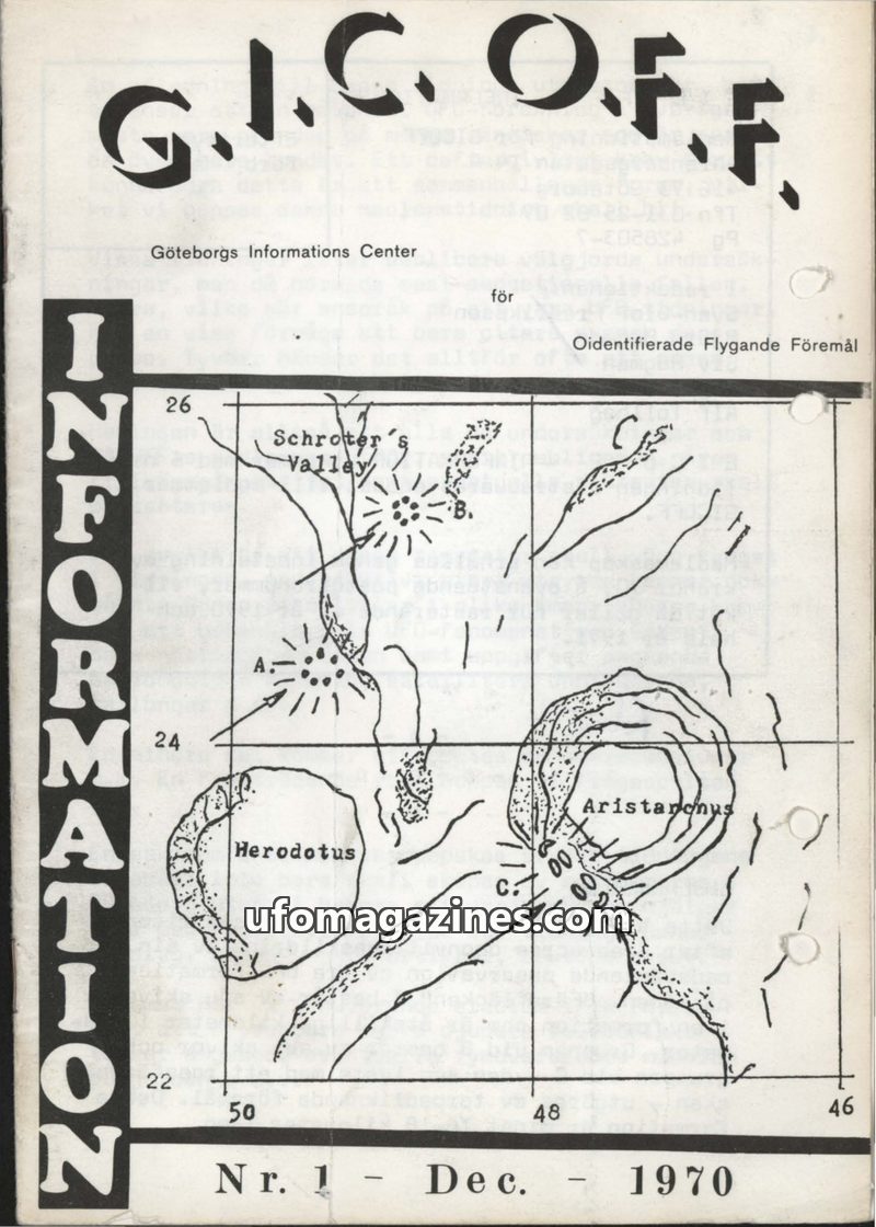 This issue of GICOFF Information, published in December 1970, focuses on UFO phenomena. It includes a detailed map of lunar craters with alleged UFO sighting points, reports on var