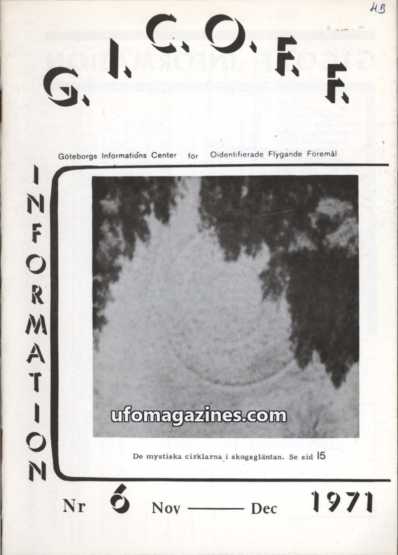 This issue of GICOFF-INFORMATION from November-December 1971 covers various UFO sightings across Sweden, including a detailed report of a 1946 encounter by Gösta Carlsson. It discu