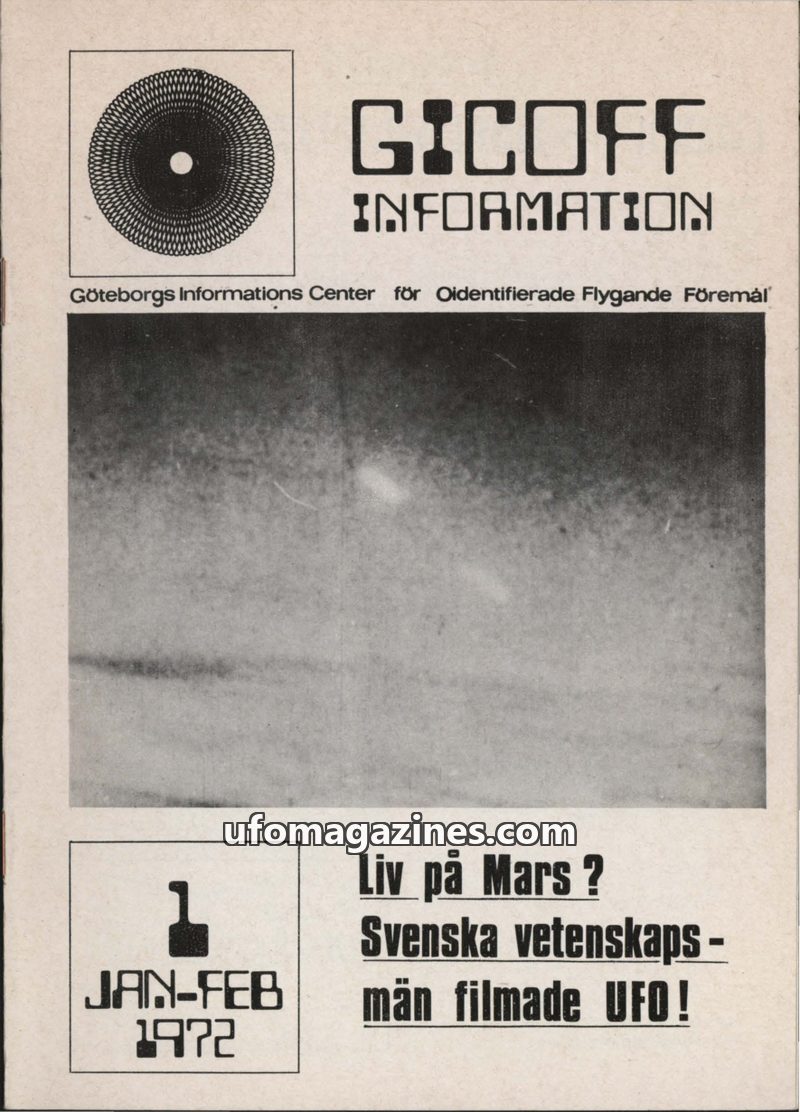 This issue of GICOFF INFORMATION from Jan-Feb 1972 focuses on UFO observations and related scientific topics. It includes a report on Swedish scientists filming a UFO during a sola