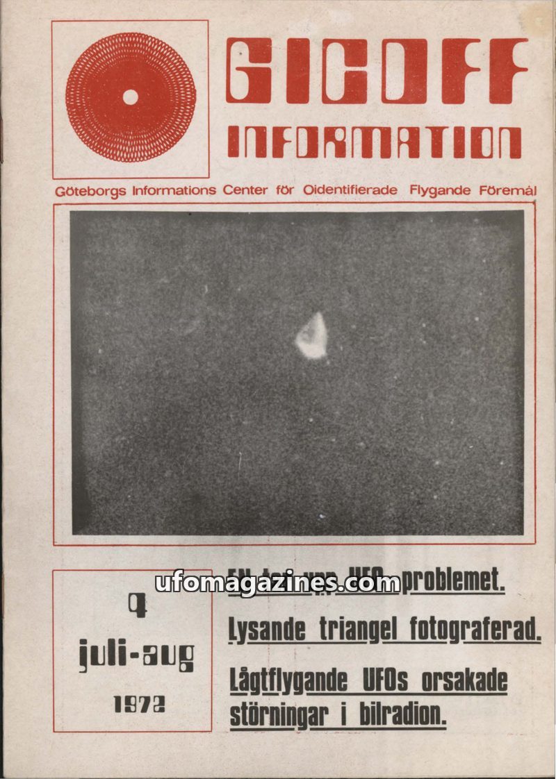 This issue of GIGOFF INFORMATION covers various UFO sightings in Sweden during July-August 1972, including a prominent sighting over Gällivare and reports of triangular objects and