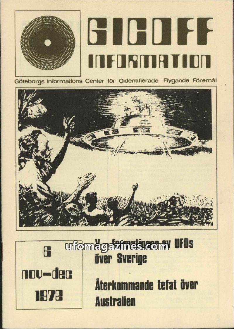 This issue of GIGOFF INFORMATION from November-December 1972 focuses on UFO sightings in Sweden and Australia. It details reports of V-formations of UFOs over Sweden and recurring