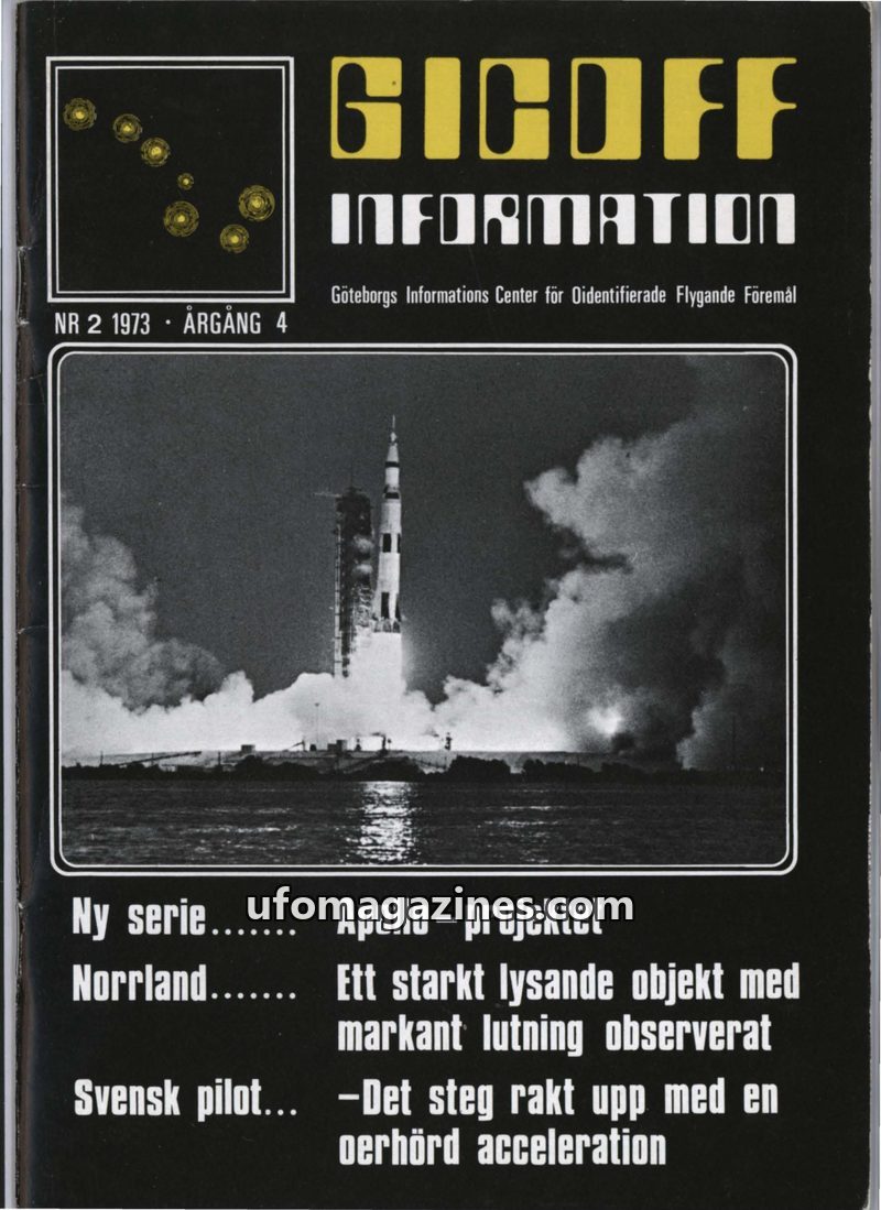 This issue of GICOFF INFORMATION from 1973 delves into various UFO sightings and related phenomena. It features a cover story on a mysterious aerial phenomenon photographed in Back