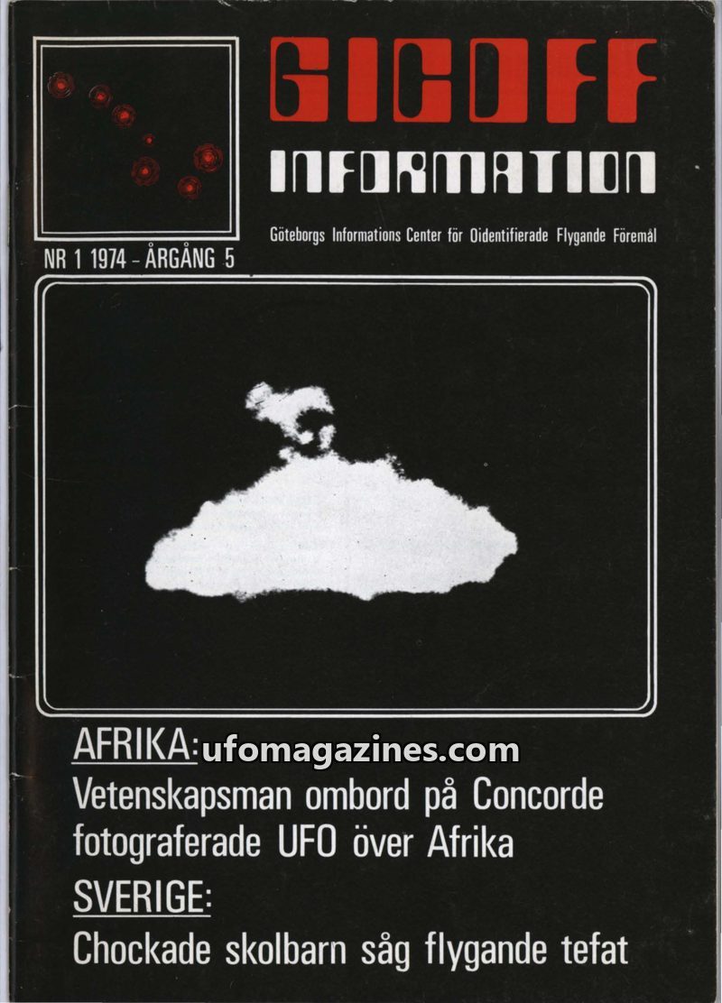 This issue of GICOFF Information from 1974 details several UFO sightings and related events. A prominent report describes a UFO photographed by a scientist on a Concorde flight ove