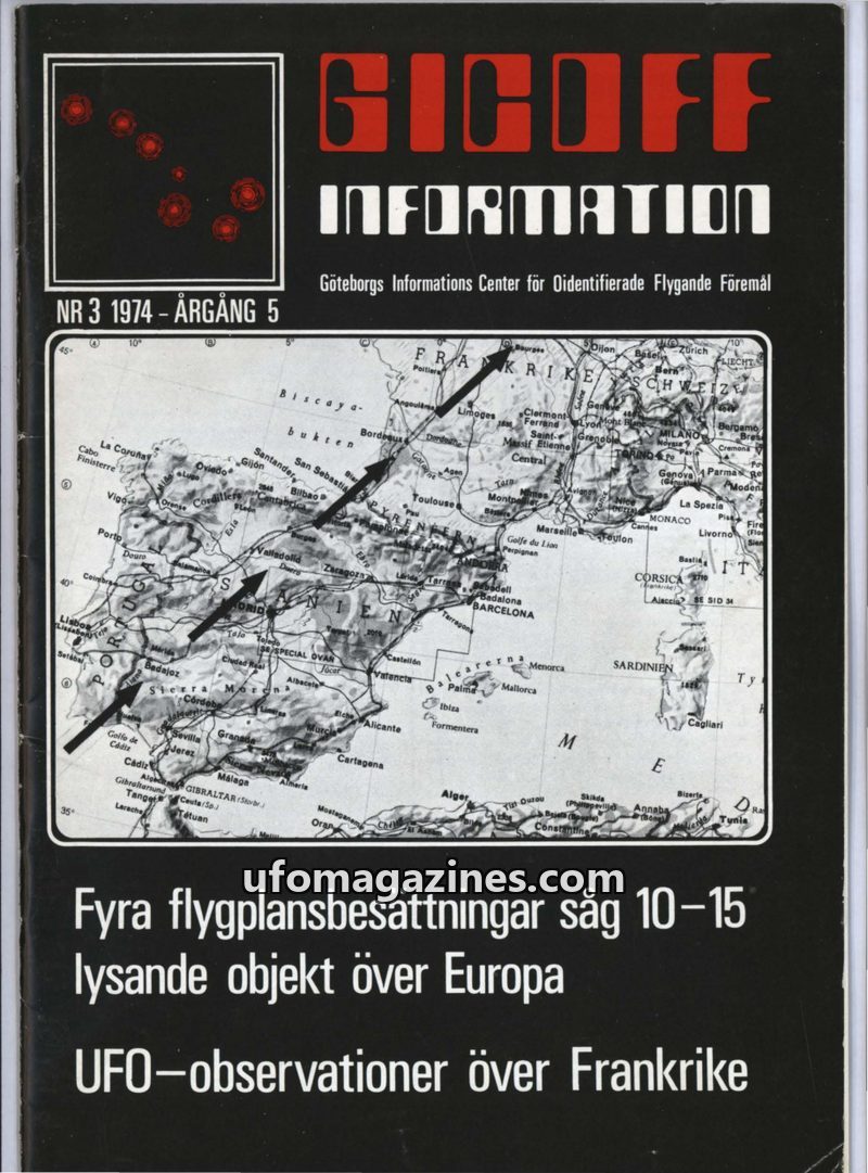 This issue of GICOFF Information focuses on UFO sightings in Europe during 1974. A significant event on January 26, 1974, involved four aircraft crews observing 10-15 luminous obje