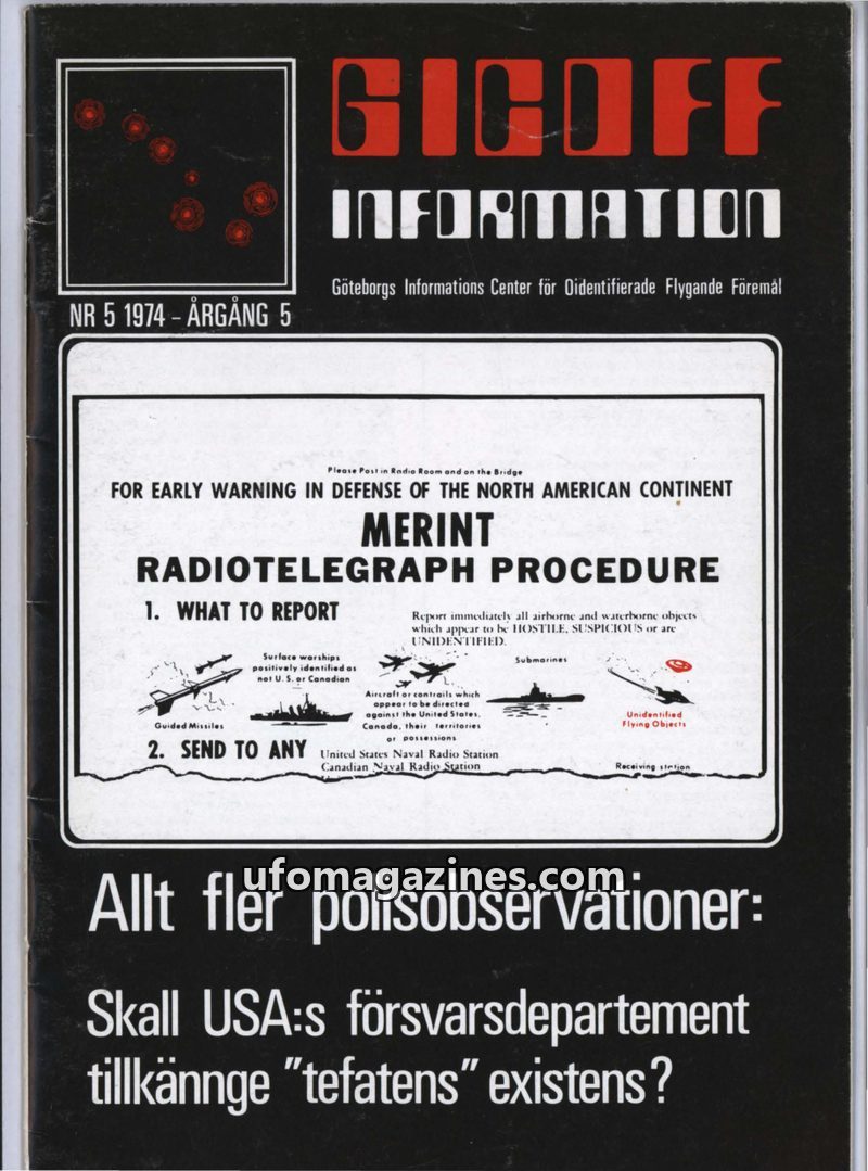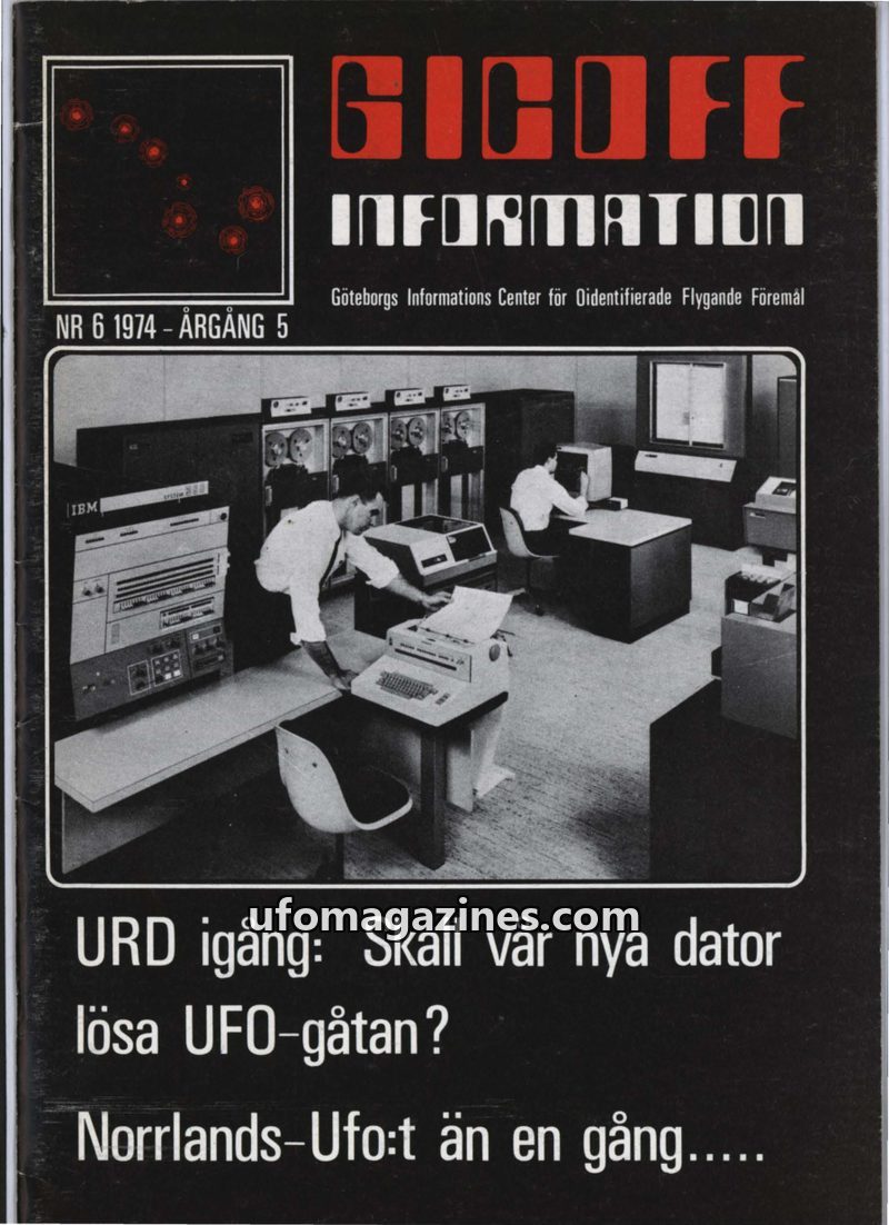 This issue of GICOFF Information from 1974 explores the potential of a new computer system, URD, to analyze UFO phenomena. It details UFO sightings from Sweden, including a ship's