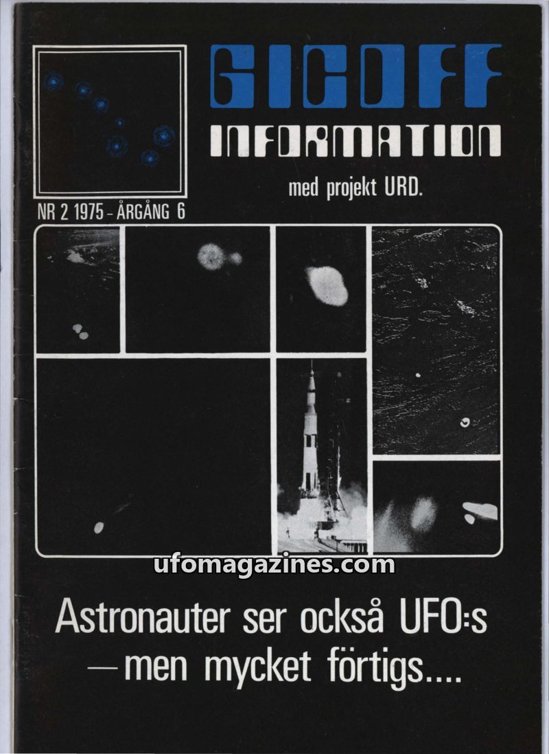 This issue of GICOFF Information from 1975 focuses on UFO sightings reported by astronauts during space missions, particularly the Apollo and Gemini programs. It highlights inciden